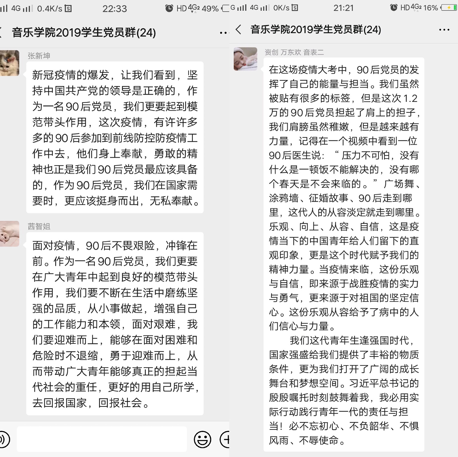 2016级音乐表演专业学生党员宋世玲说,“新时代的中国青年是好样的!在这场人民战“疫”中,广大青年用实际行动充分证明,他们是能被祖国信任的,能被祖国给予希望的,能够担当大任的。而在这次疫情当中,作为党员的我们也可以做出一点小小的贡献,比如说为身边的人提供积极向上的引导,化解他们的焦虑情绪;在自己所在的社区参加志愿服务活动等。我认为,当前行的接力棒交接到我们当代青年手中的时候,我们能毅然挺起坚实的臂膀,在人民需要的时刻挺身而出、迎难而上,用奉献与责任绘就新时代青年的青春担当。”