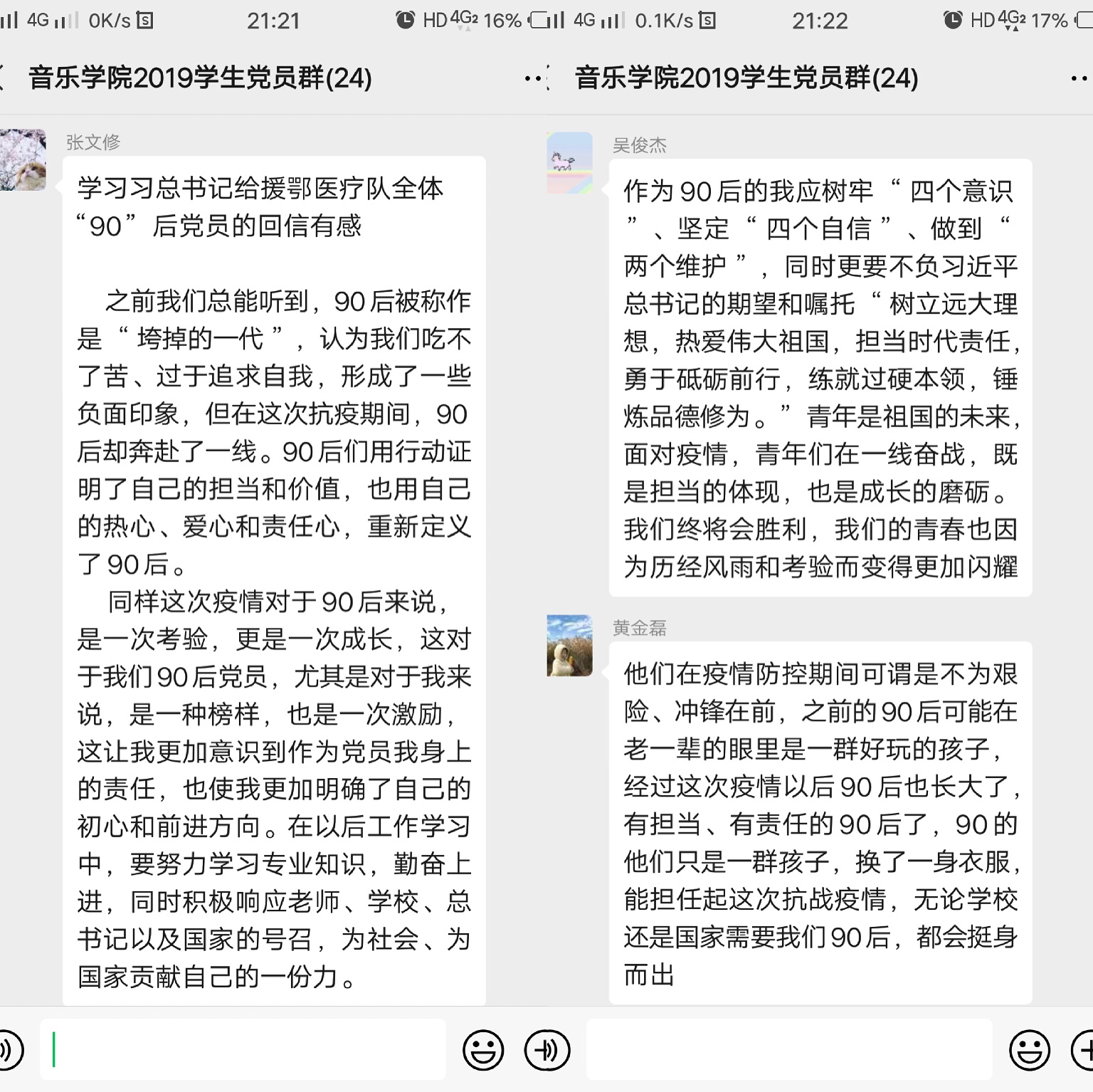 2017级音乐学专业学生党员张文修说,“之前我们总能听到,90后被称作是“垮掉的一代”,认为我们吃不了苦、过于追求自我,形成了一些负面印象,但在这次抗疫期间,90后却奔赴了一线。90后们用行动证明了自己的担当和价值,也用自己的热心、爱心和责任心,重新定义了90后。同样这次疫情对于90后来说,是一次考验,更是一次成长,这对于我们90后党员,尤其是对于我来说,是一种榜样,也是一次激励,这让我更加意识到作为党员我身上的责任,也使我更加明确了自己的初心和前进方向。在以后工作学习中,要努力学习专业知识,勤奋上进,同时积极响应老师、学校、总书记以及国家的号召,为社会、为国家贡献自己的一份力。”