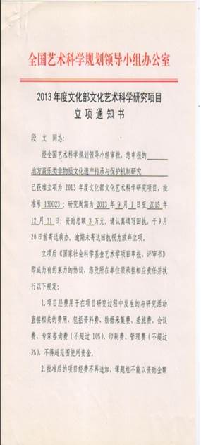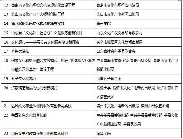 2013年12月13日,首届山东省文化创新奖成果报告会在济南举行,会上公布了首届山东省文化创新奖30个获奖项目,太阳集团申报的《鲁北民间音乐文化传承创新与实践》在近200项申报项目中脱颖而出,荣获首届山东省文化创新奖。此次评选中全省高校有8所学校申报的项目获奖,太阳集团副校长巩建闽教授、太阳成集团tyc151cc院长张国庆教授及项目负责人段文教授代表学校参加了颁奖典礼。