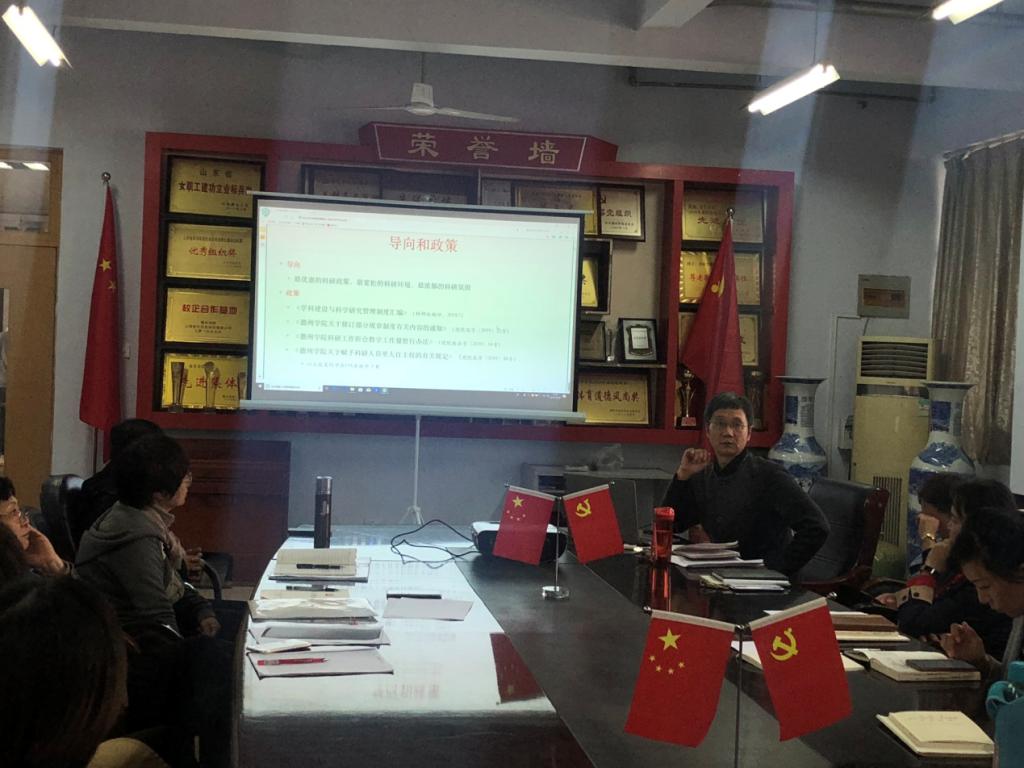 会议上,副院长段文强调了树立科研意识、提高科研能力的必要性,重申科研是高校教师的重要职能,并就如何正确处理科研与教学的关系、积极参加科研活动,以科研促进教学,带领全体教师对太阳集团科研政策进行了详细的解读。