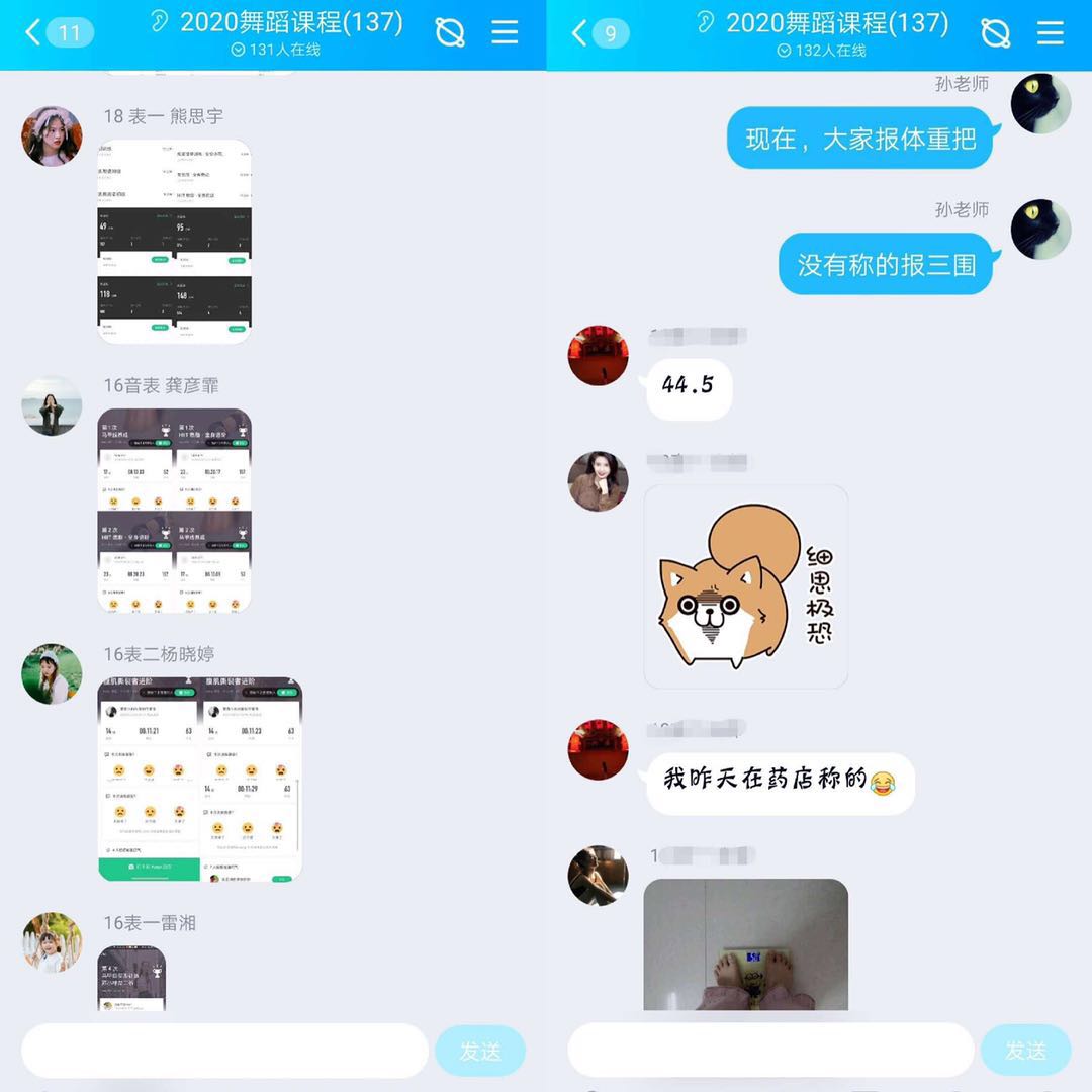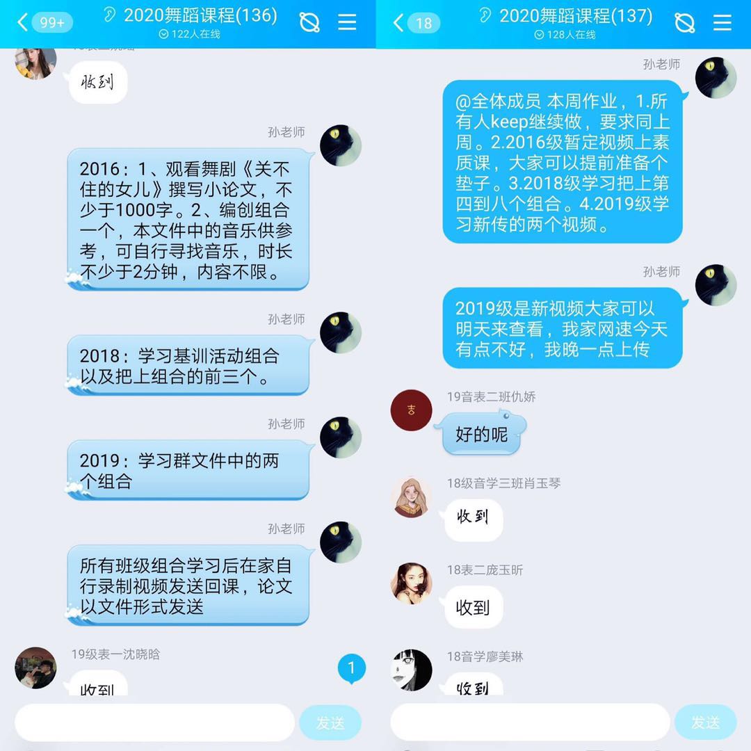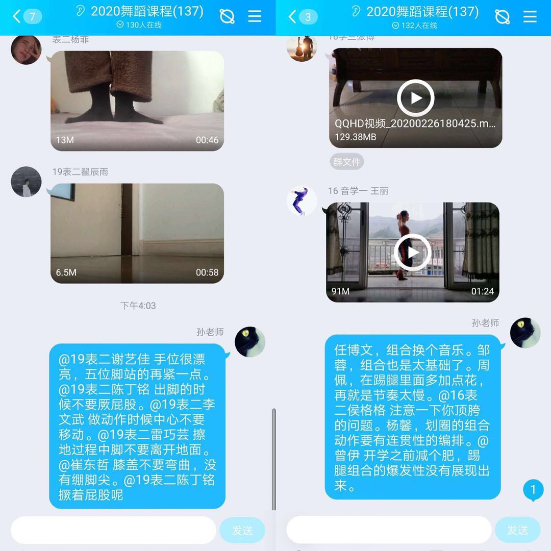 为解决无法近距离观察学生学习组合动作情况的问题,孙晓丹老师将需要学习的动作组合视频提前上传至QQ群,学生学习后录制好视频传回,由老师一一点评,以确保每位学生掌握组合动作的同时保证动作质量。