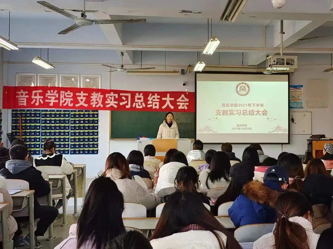 会议伊始,音乐学系系主任杜乡对此次实习支教工作进行了总结。她表示,我院2018级支教实习活动在学院领导的高度重视及各指导老师的相互配合下取得了圆满成功。支教任务带来的不仅是对学生个人能力与经验的提升,更重要的是为当地教育带去了新鲜的血液,同学们在支教过程中,充分发扬了吃苦耐劳的精神,不仅出色完成了日常教学任务,还利用自己的专业知识积极服务于当地的音乐基础教育,取得了丰硕成果,并获得了当地教育部门和各支教学校的一致好评。