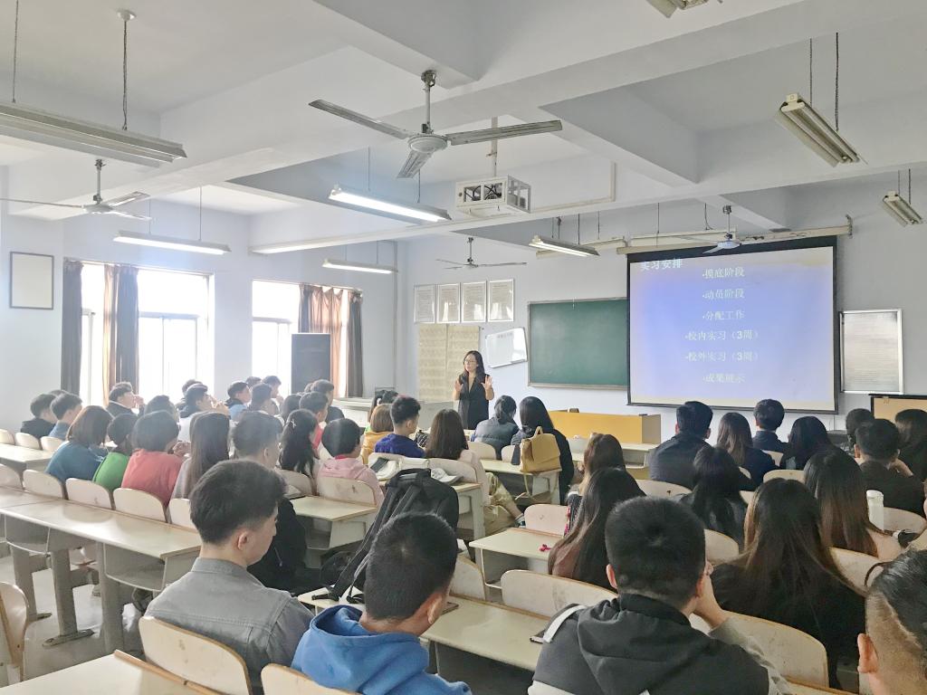 实践教研室主任梁娜对音乐表演专业毕业实习设计进行解读。对校内实习、校外实习的目标、具体任务以及各实习单位的基本情况作了详细的介绍,并向2016级同学展示了往届毕业生毕业实习走入社区、走进中小学校的精彩视频资料。同时要求同学们实习期间,要严格遵守各项规章制度,虚心学习,团结协作,圆满完成实习任务。