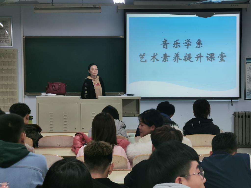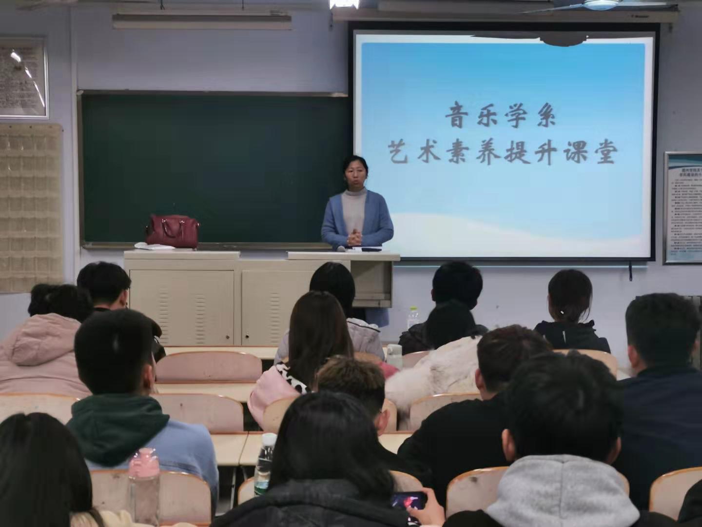 为了提升太阳成集团tyc151cc学生艺术修养,增强音乐学专业学生对艺术作品的鉴赏能力、审美能力、理解能力、评价能力,太阳成集团tyc151cc于11月6日晚在2004合堂教室举行了“艺术素养提升课堂”活动,音乐学系系主任杜乡,器乐教研室主任马立婧参加了此次活动。