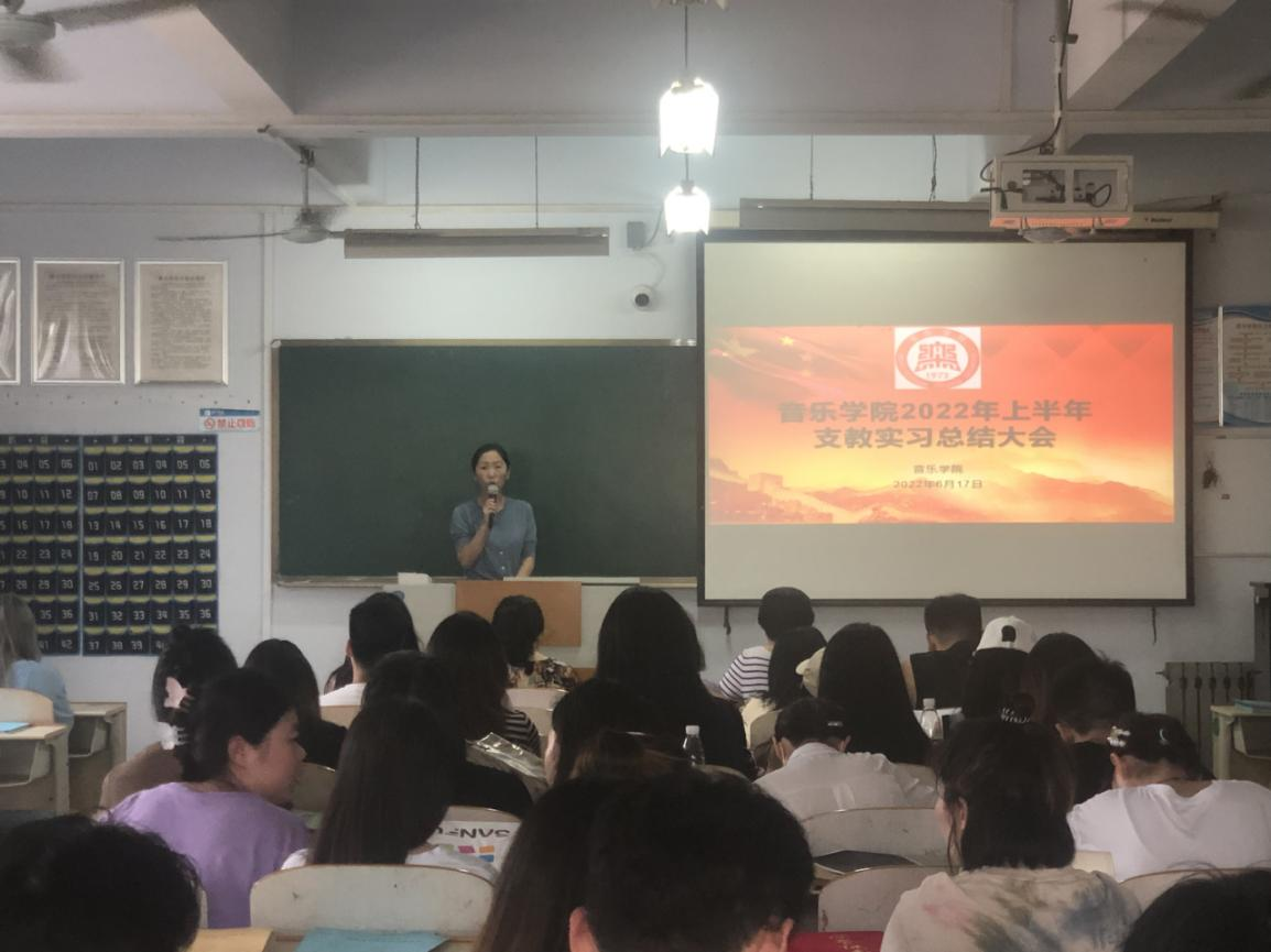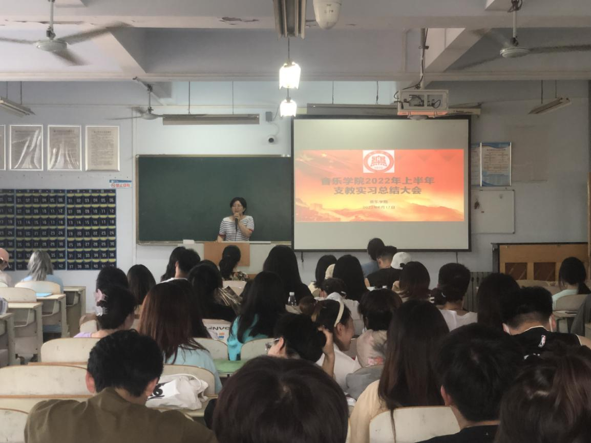 最后,音乐学系主任杜乡对此次实习大会进行了总结发言。她首先肯定了同学们的实习成果以及指导教师的辛苦付出,并指出实习支教是检验教学成果最重要的环节,希望同学们以实习为契机,切实提升自身专业素养,以更好的精神面貌走好未来的就业道路。