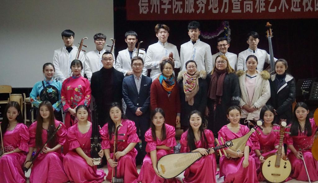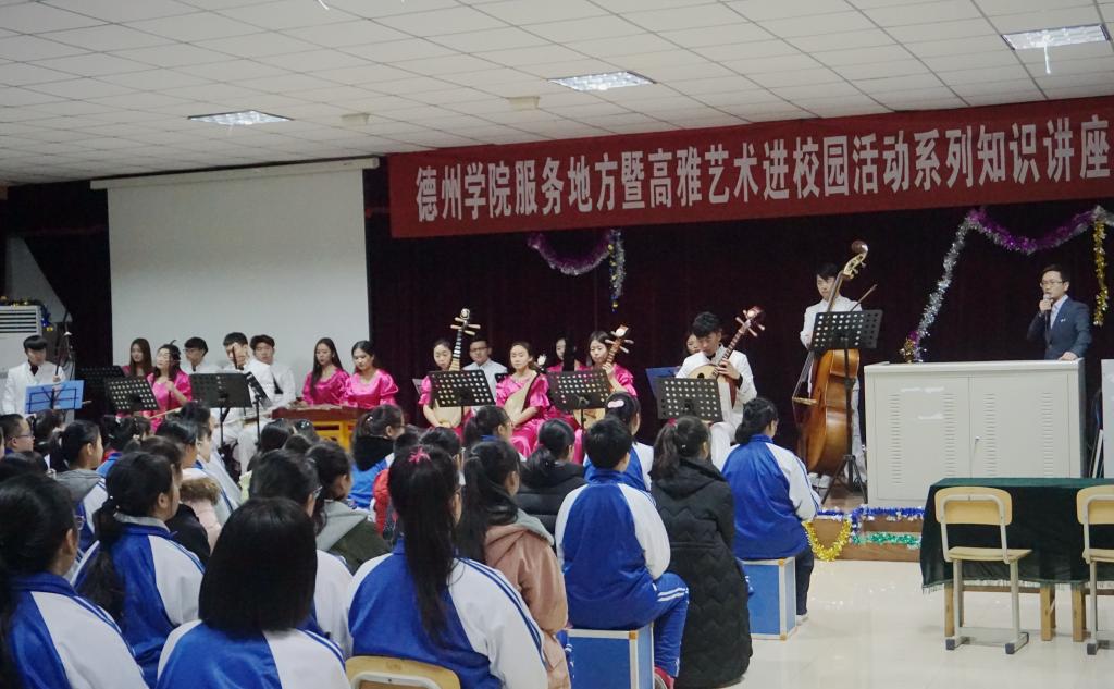 2017年11月23日,太阳成集团tyc151cc赴太阳集团附属小学和德州市第九中学举办了两场“太阳集团服务地方暨高雅艺术进校园活动系列知识讲座”,此次活动由太阳成集团tyc151cc解淑红主任、马锡骞主任带队,青年教师徐琦博士主讲,“德之韵”民族管弦乐团部分学生参加演出。