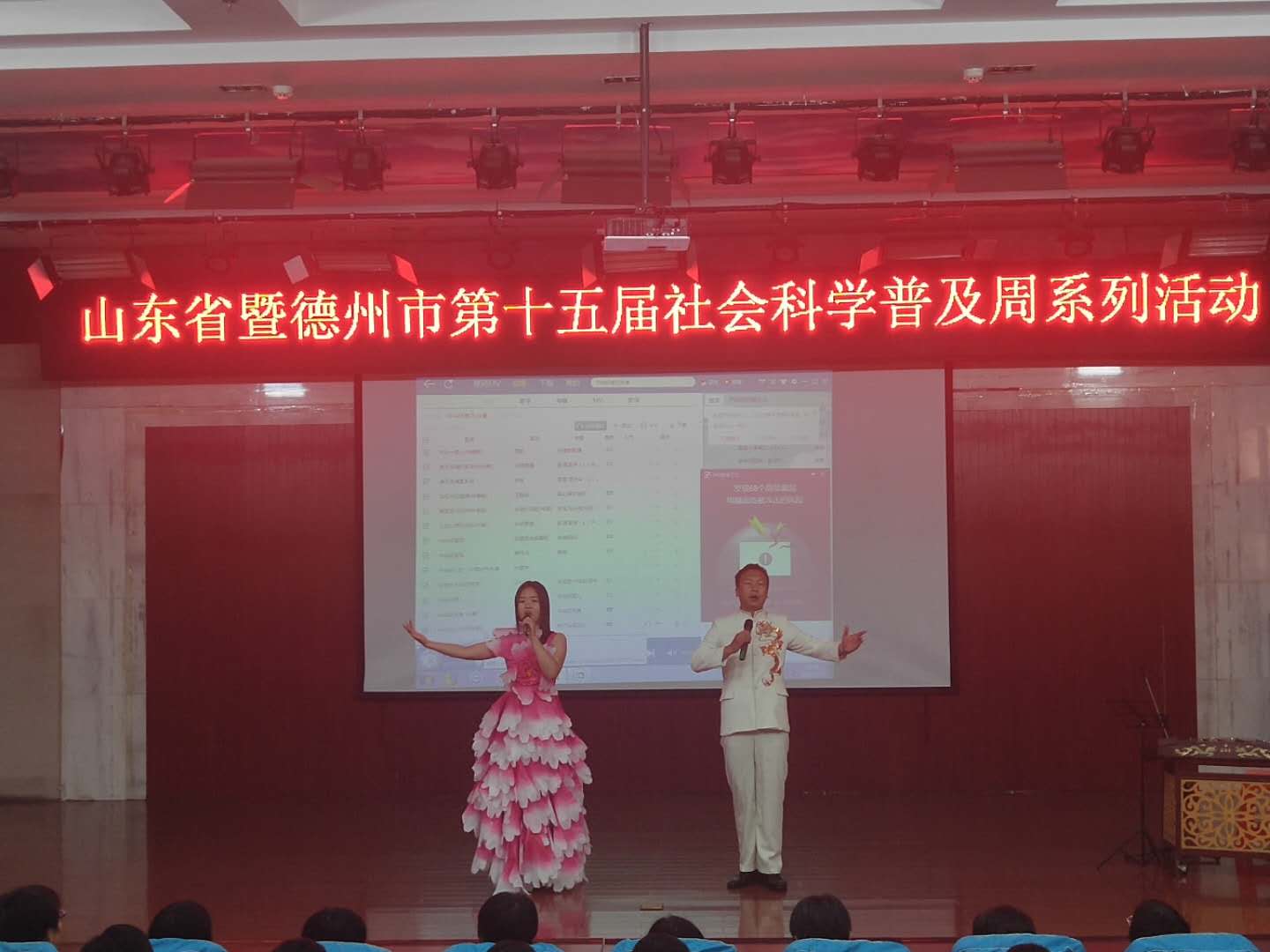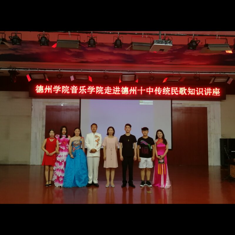 6月14日,山东省暨德州市第十五届社会科学普及活动——太阳成集团tyc151cc走进十中进行传统民歌讲座及展演。首先太阳成集团tyc151cc音乐学系声乐教研室主任杜乡开展了传统民歌讲座,分别从民歌的历史发展、民歌的分类、民歌的特点等方面进行了简要的讲解。随后太阳成集团tyc151cc学生分别对德州民歌、山东民歌、山西民歌、河北民歌等各地民歌进行了展演,演唱充分展示了各地民歌的风格特点,博得现场观众的阵阵喝彩。演唱过程中杜乡老师边讲解、边导聆,同学们听的聚精会神、津津有味。