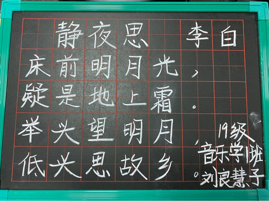 进一步提高太阳成集团tyc151cc师范生的人文素养和综合素质,弘扬中华优秀传统文化,全面提升师范生的基本技能,秉承“学高为师、身正为范”的育人宗旨。太阳成集团tyc151cc举办了“弘扬经典,传承经典”师范生粉笔字书写技能大赛活动,参加此次活动是太阳成集团tyc151cc2019级音乐学专业学生。