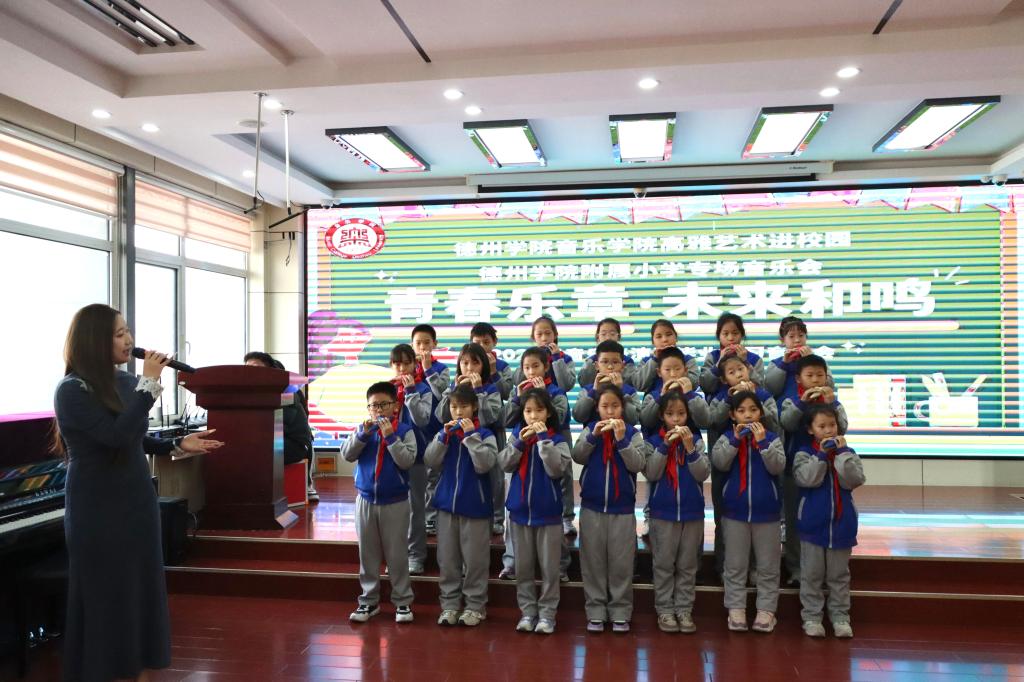 活动中,一场特别的跨龄合作尤为动人:太阳集团的学姐以女声独唱演绎《小美满》,而附属小学陶笛社团的孩子们则以陶笛伴奏相和。这一互动场景,正是高雅艺术进校园的生动体现——艺术跨越年龄,美育浸润心灵,美好在琴笛和鸣中悄然传承。