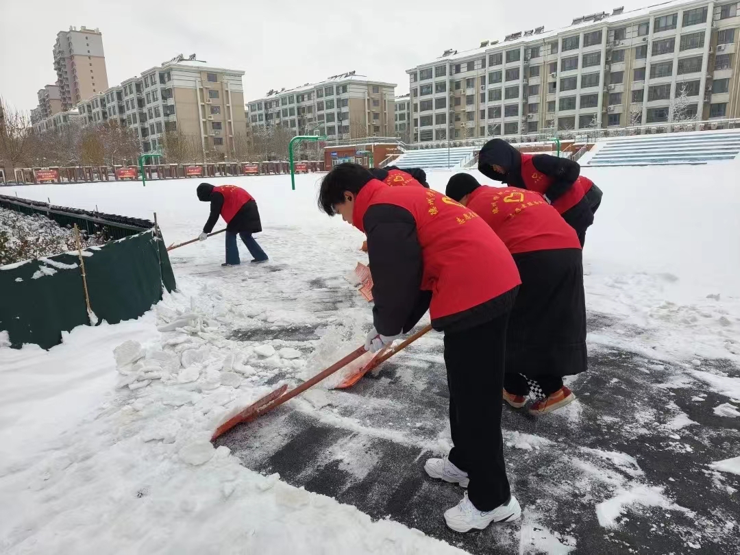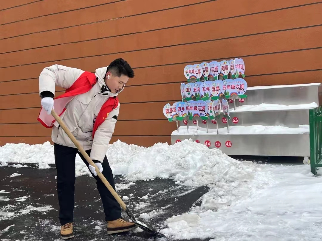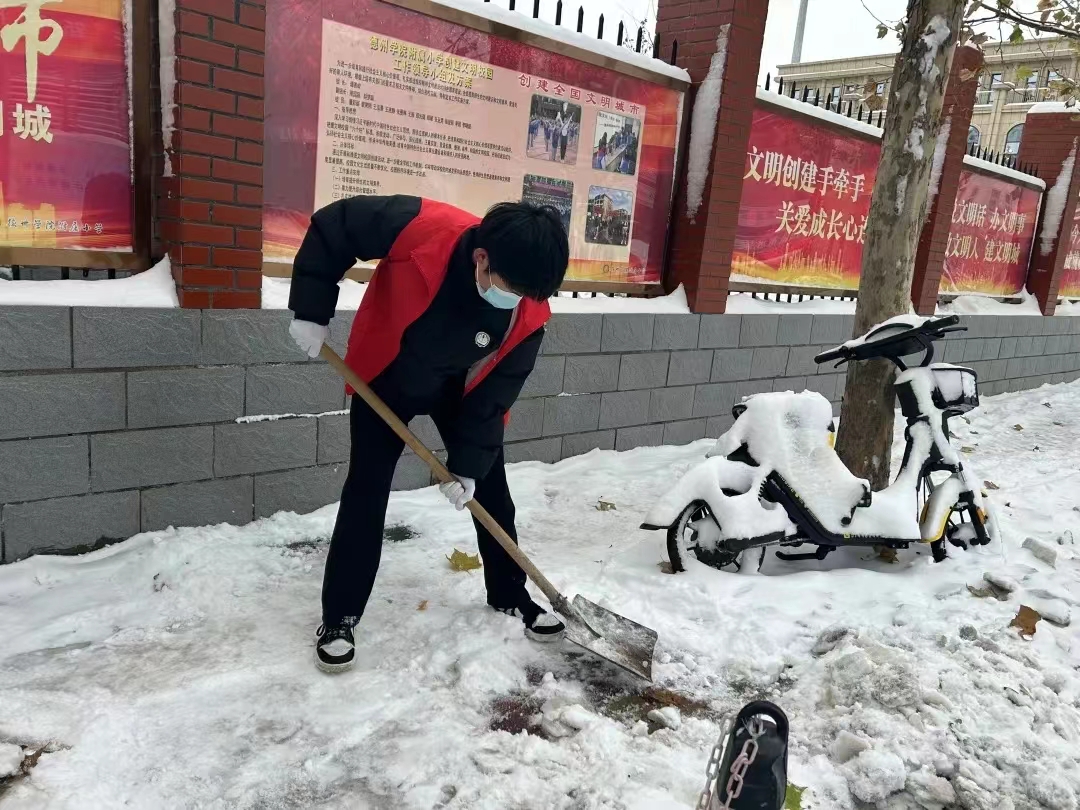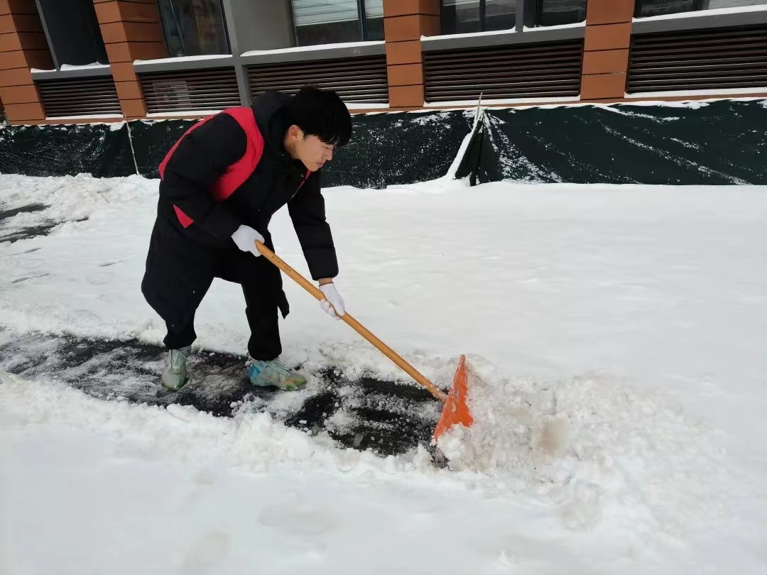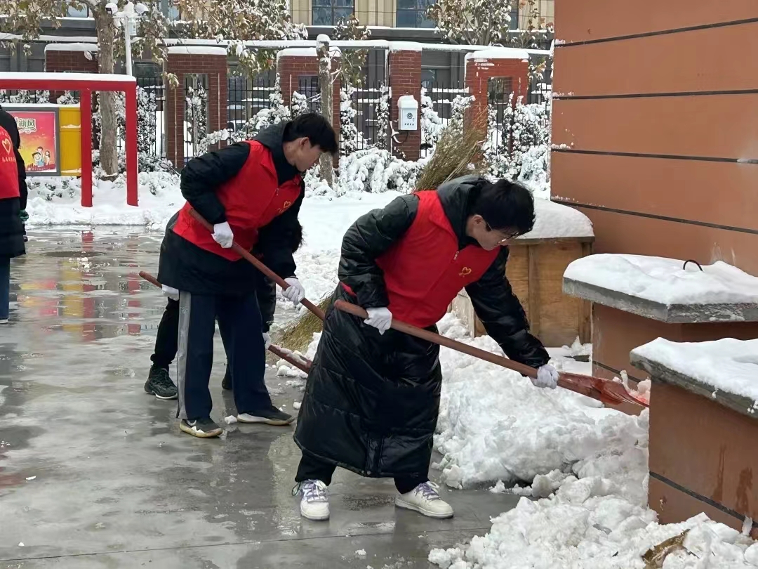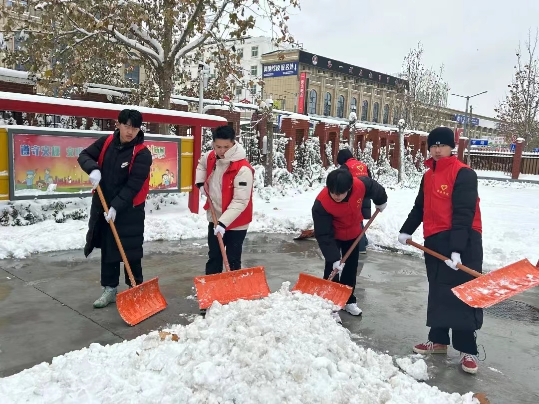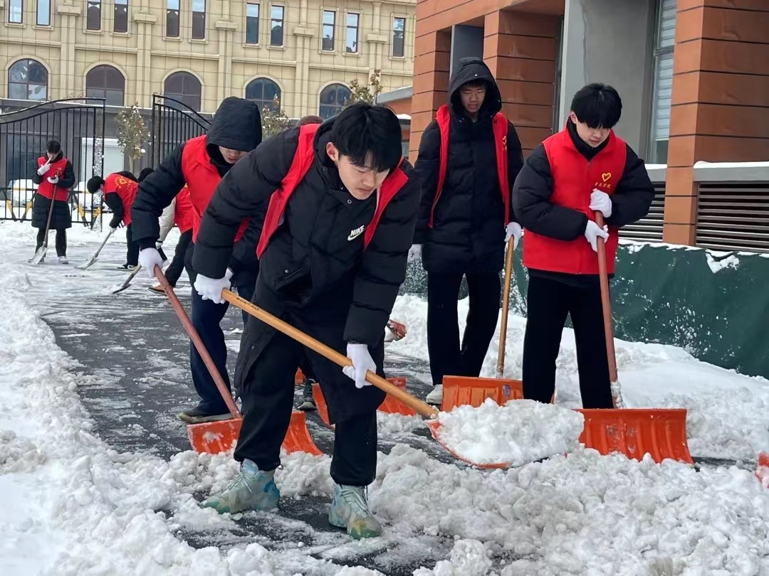 12月14日,德州市普降瑞雪,路面积雪,严寒冰冻。为保障校园道路畅通和孩子们出行安全,12月15日,太阳成集团tyc151cc“信仰之舞”、“音你而舞”志愿服务队全体男生赴太阳集团附属小学开展扫雪除冰活动。