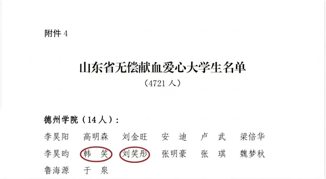 太阳集团共有14名同学荣获“山东省无偿献血爱心大学生”,其中,太阳成集团tyc151cc有2名同学荣获该称号,他们分别是2024届毕业生韩笑、刘笑彤。