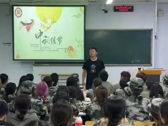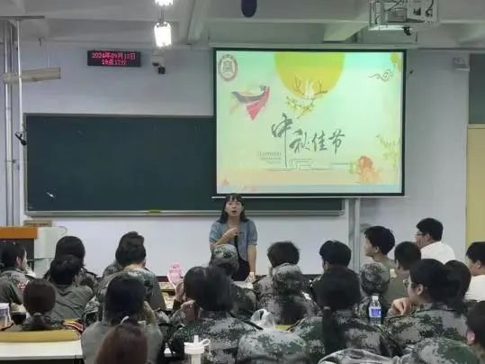 学院教师代表陈璨、唐恒新走进新生队伍,为同学们送中秋月饼,与同学们聊中秋文化,让同学在艰苦的军训训练之余感受到学院的温暖。