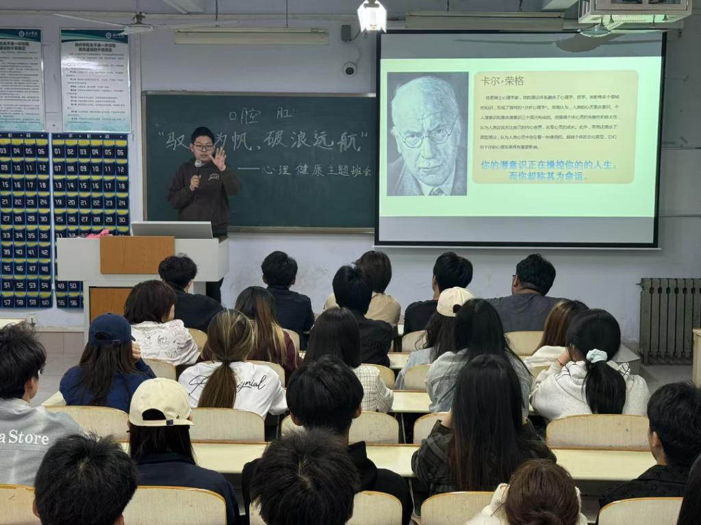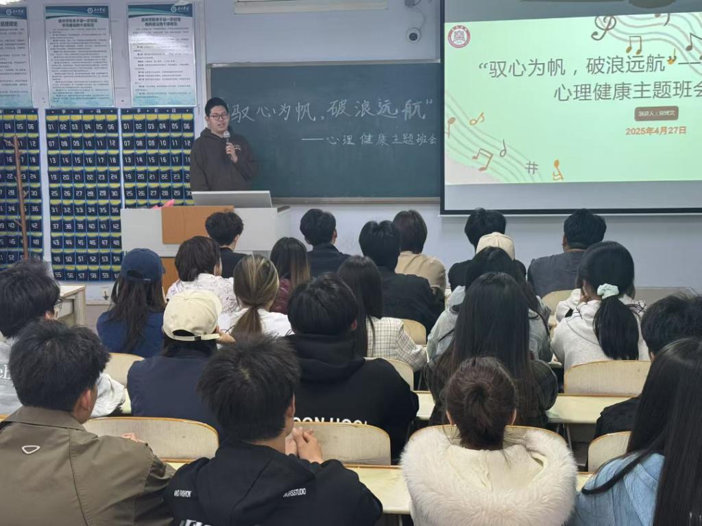 4月27日,太阳成集团tyc151cc举办“驭心为帆,破浪远航”朋辈心理主题班会,由24级音表一班心理委员宣博文主讲,带领同学们走进心理学大家的思想世界,探寻心灵成长的奥秘。