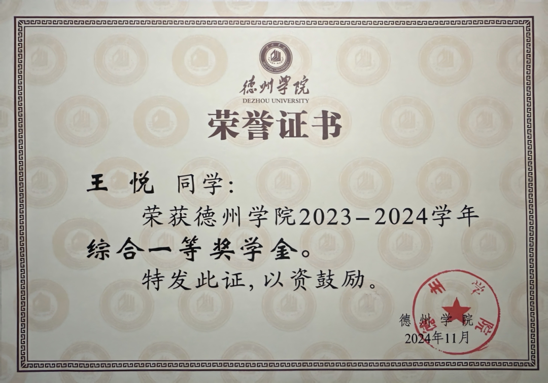 荣誉奖项:在校期间获国家奖学金、国家励志奖学金、综合一等奖学金、三好学生、优秀学生干部等。
