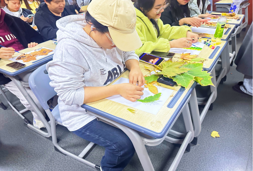 活动前,学习部精心筹备,不仅提前收集了校园内的银杏叶、梧桐叶、枫叶等各类秋日落叶,还在教室内备好画纸、胶水、剪刀等创作工具,为同学们营造了温馨舒适的创作氛围。活动中,学子们充分发挥想象力,将自然素材与艺术灵感巧妙融合:银杏叶层层叠叠,铺成充满暖意的小木屋屋顶;还有同学将落叶与音符元素结合,勾勒出跳动的五线谱。大家或独自专注构思,或三五成群交流协作,原本普通的落叶在同学们手中被赋予了全新的生命与意义。有同学表示:“拼贴作品的过程特别治愈,让我在忙碌的专业课学习中找到了放松的出口,也发现了生活中的小美好。”