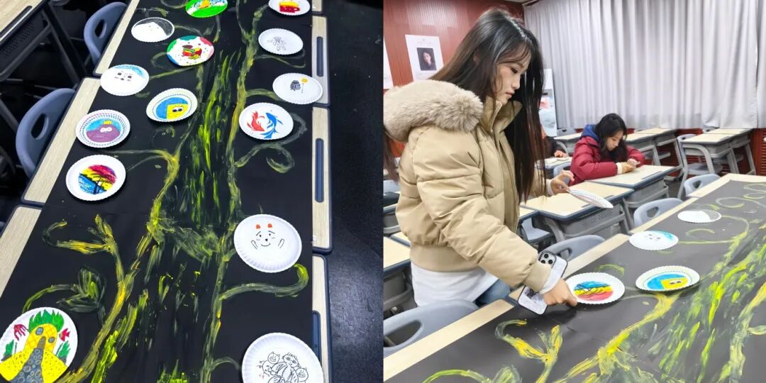 活动中,主讲人以“种子的旅程”为引,引导同学们闭目静思,想象一颗种子从播种、萌芽到抽枝展叶的过程——如同个体生命,每一年轮都镌刻独特经历,每种色彩皆映射专属特质。随后,大家在圆形画纸上以绘画形式呈现“自我生命年龄”:或用工笔细描求学阶段的坚韧,或用浓墨重彩标注兴趣绽放的热忱,抑或以留白传递对未来的期许。这些承载个人生命印记的作品被逐一粘贴于象征集体生命力的“大树”展板,原本独立的“年轮”汇聚成枝繁叶茂的精神森林,直观诠释了个体独特性与群体联结性的统一。