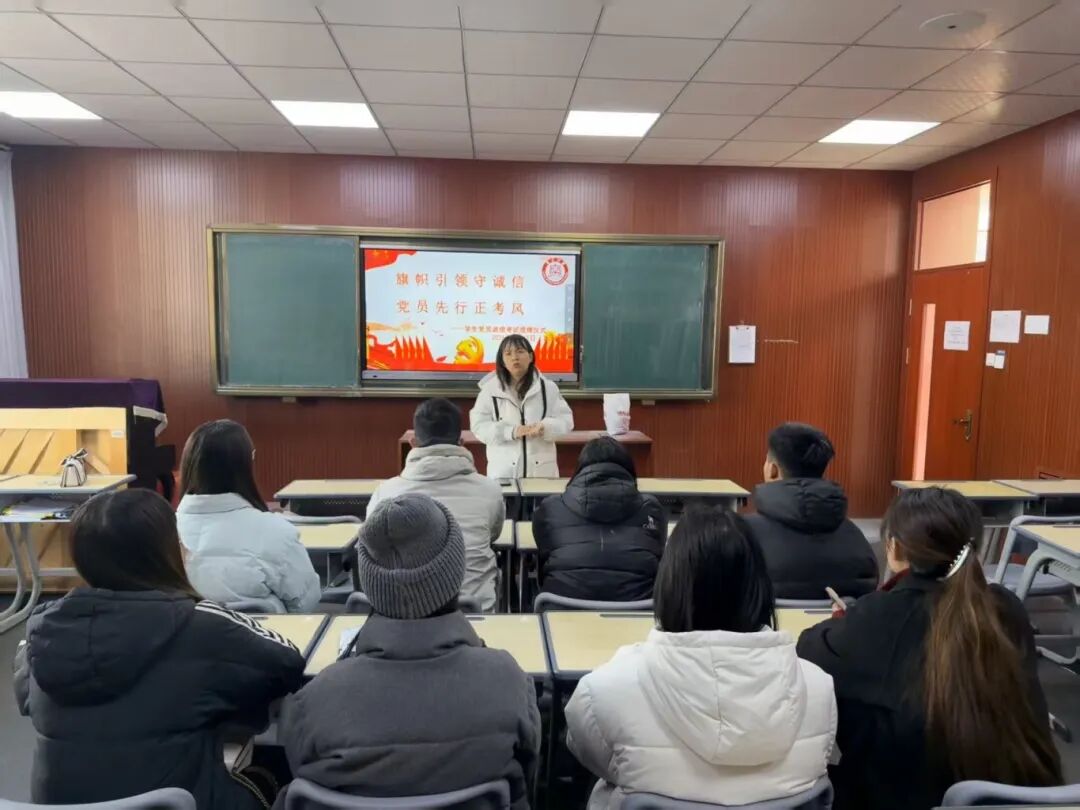 随后,张艳蕊老师发言,再次强调诚信应考的重要意义,并提出具体要求:在考试期间,学生党员应将党员标识牌置于桌面醒目位置,主动亮明身份,发挥“一名党员一面旗帜”的示范引领作用;同时,要积极关心和帮助学业困难的同学,建立结对帮扶机制,进一步彰显党员的先进性。她表示,党员身份既是荣誉,更是责任,必须以实际行动树立榜样,推动形成优良考试氛围。此外,她还提醒同学们高度重视假期安全,切实保护好人身与财产安全,确保度过一个平安、充实的假期。