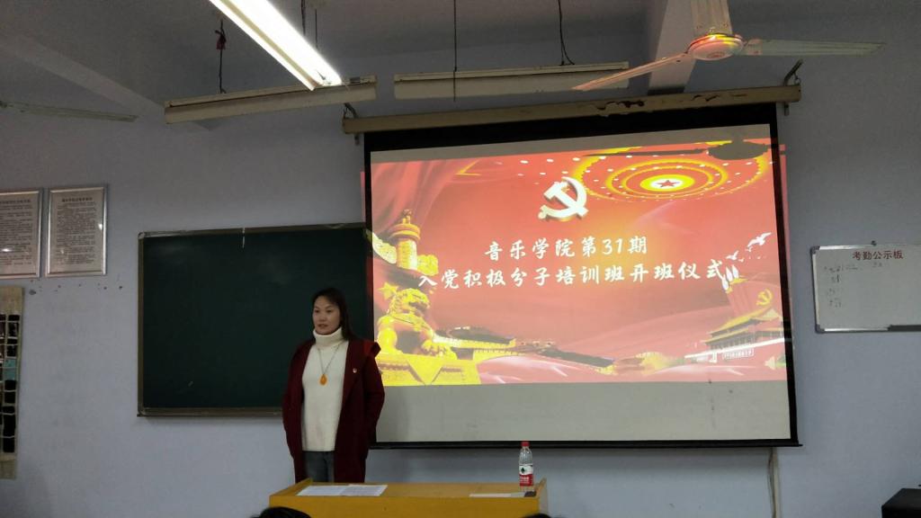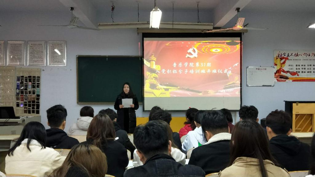 4月9日下午,太阳成集团tyc151cc在音乐楼3004举行业余党校第31期入党积极分子培训班开班仪式。党总支书记高莉、副书记贺昱、学生党支部书记史璇、组织委员李曼宁及36名师生入党积极分子到场参加。