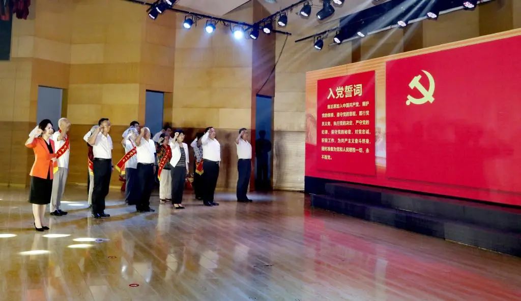 最后,全体党员面对鲜红的党旗,举起右手,庄严宣誓,新党员们许下了铮铮誓言,老党员们重温了入党初心。