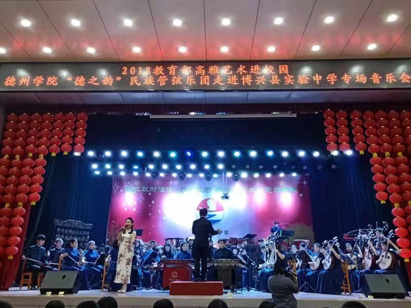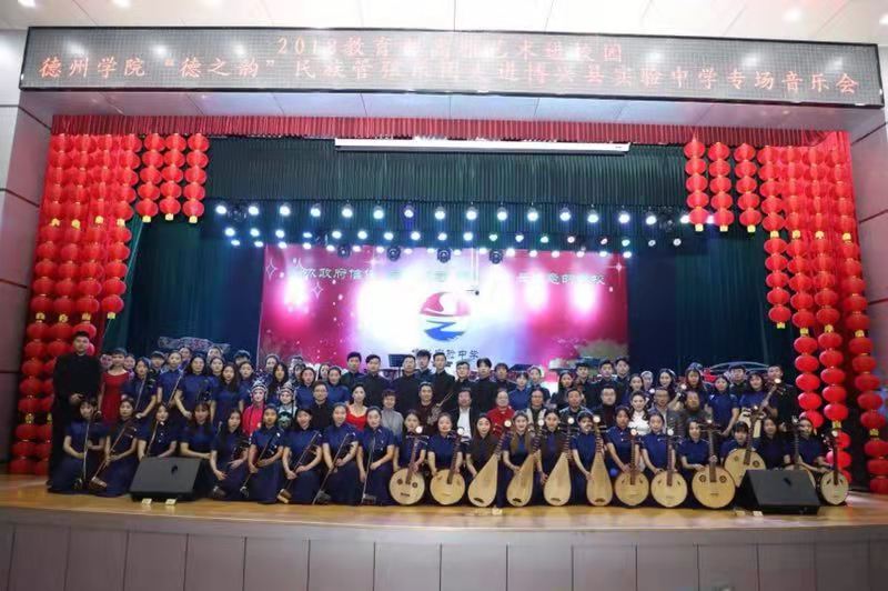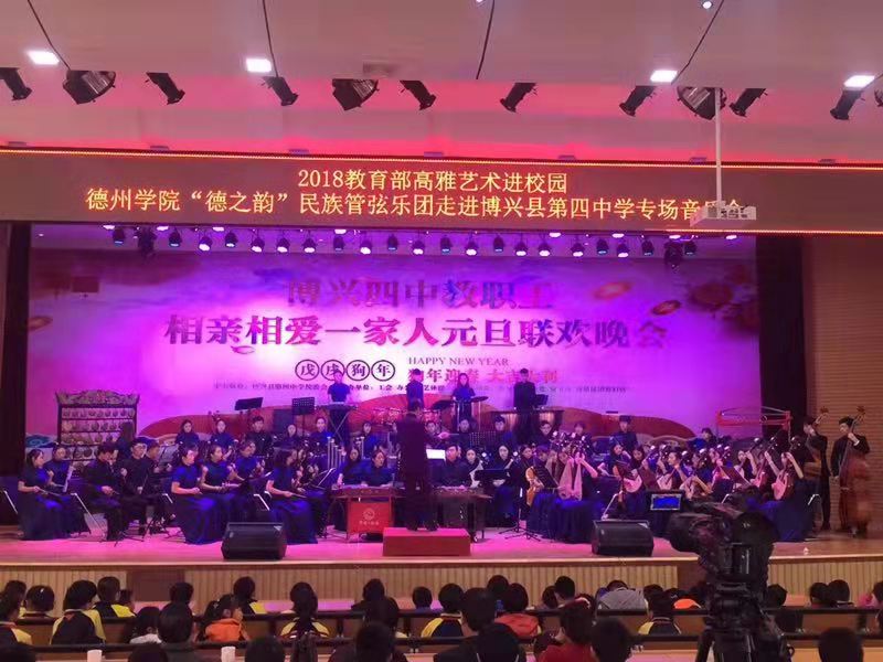 由教育部、文化部、财政部联合主办,山东省教育厅和太阳集团承办的“高雅艺术进校园”系列活动顺利开展,太阳成集团tyc151cc院长田屹、副院长段文带领“德之韵”民族管弦乐团先后于11月12日、13日赴博兴县实验中学和博兴县第四中学成功举办了专场音乐会。