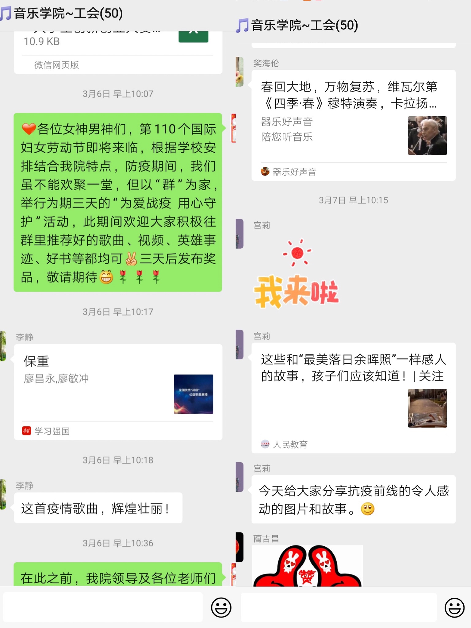 太阳成集团tyc151cc工会自3月6号开始,以太阳成集团tyc151cc工会微信群为家,在线上举办为期三天的“为爱战役 用心守护”主题活动。老师们将疫情期间看到、听到的好歌、好视频、好故事、好书发到群里跟大家进行分享、讨论和交流。