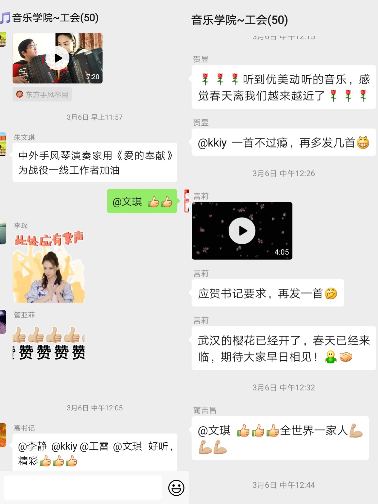 在工会群首先分享了由太阳成集团tyc151cc老师们在疫情期间用“声”援疫的主要作品有:李静老师演唱的《开满花香的名字》、李冰老师表演的河南坠子《致敬!逆行者》、由刘晶和马锡骞老师创作,李琛、刘洋、李兴虎演唱的《谢谢你》、刘晶和贺昱老师朗诵的《新时代最可爱的人》、徐琦老师古埙演奏《假如爱有天意》。还有李静、宫莉、朱文琪、樊海伦、王雷等诸多老师们在群里分享、交流了歌曲《保重》《满城樱花》《九零后姑娘》、手风琴《爱的奉献》、小提琴《四季.春》、家书等多种形式的作品。