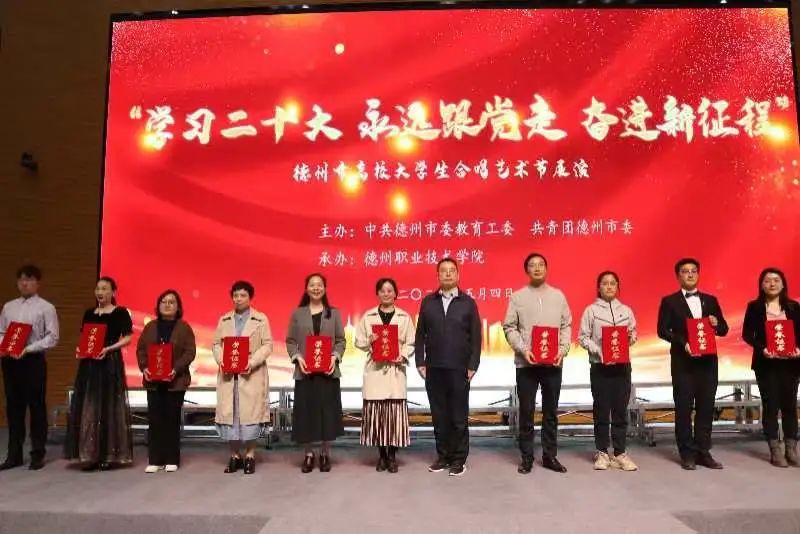 5月4日,由中共德州市委教育党工委、共青团德州市委主办、德州职业技术学院承办的“学习二十大 永远跟党走 奋进新征程”德州市高校大学生合唱艺术节展演活动在德州职业技术学院举行。太阳成集团tyc151cc48名学生代表组队参加。吴丽老师担任指挥,张利鑫老师进行钢琴伴奏。