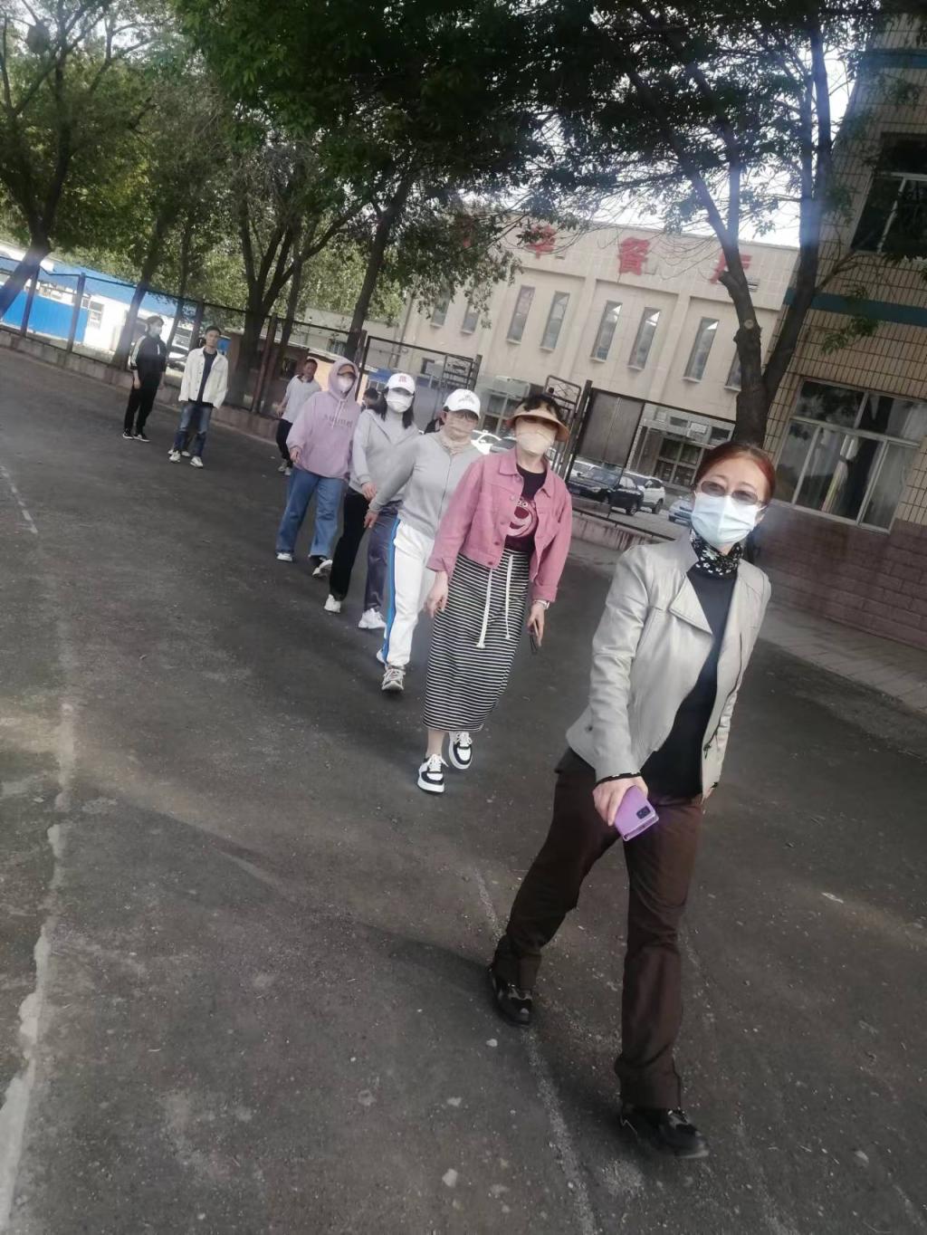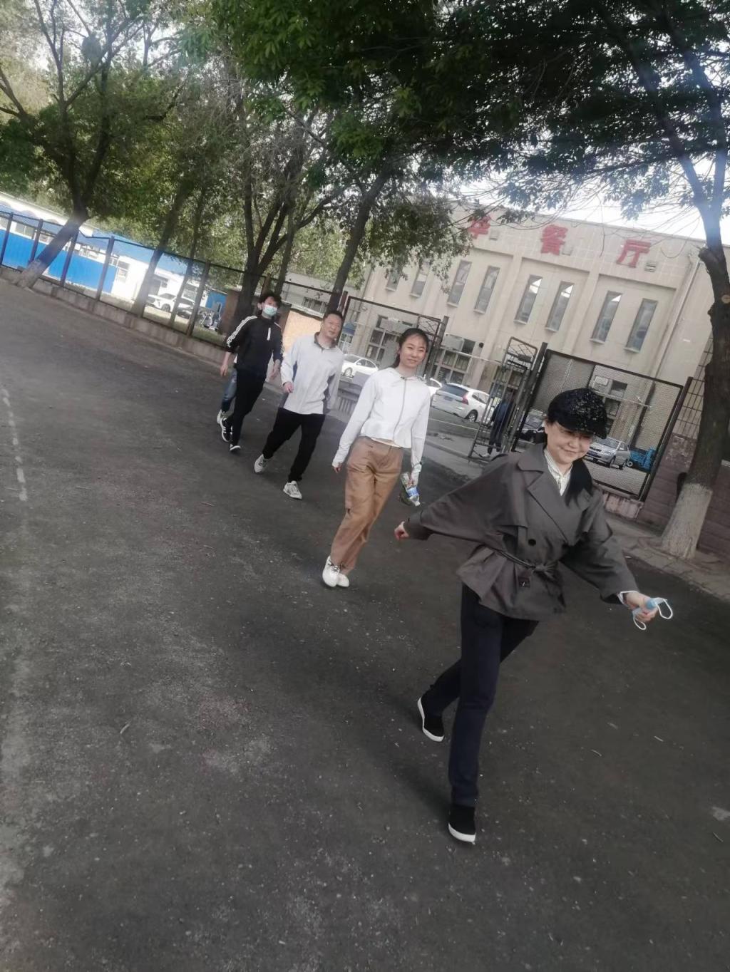 之后,在音乐楼后操场跑道,以教研室为单位分成4个小队,绕跑道健步走一小时。