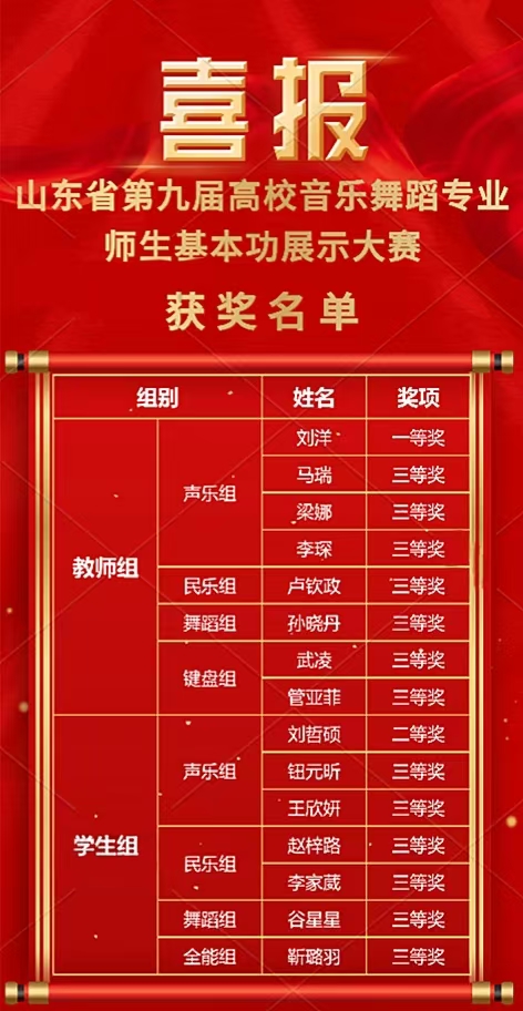 喜报!太阳成集团tyc151cc师生在山东省第九届高校音乐舞蹈专业师生基本功展示大赛中喜获佳绩