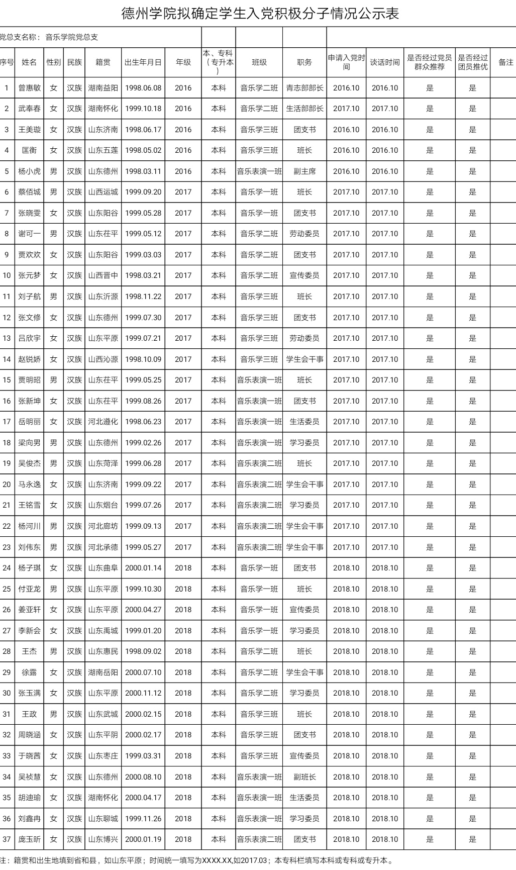 经党组织培养考察,通过党员、群众无记名投票推荐和团员推优,支委会讨论研究,拟确定魏丽、曾惠敏等38人为入党积极分子。为增强工作的透明度,接受党内外群众的监督,确保党员后备队伍的质量,根据上级文件精神和《中共太阳集团委员会发展党员工作实施细则》的要求,现将拟确定入党积极分子的基本情况公示如下(详见附表):