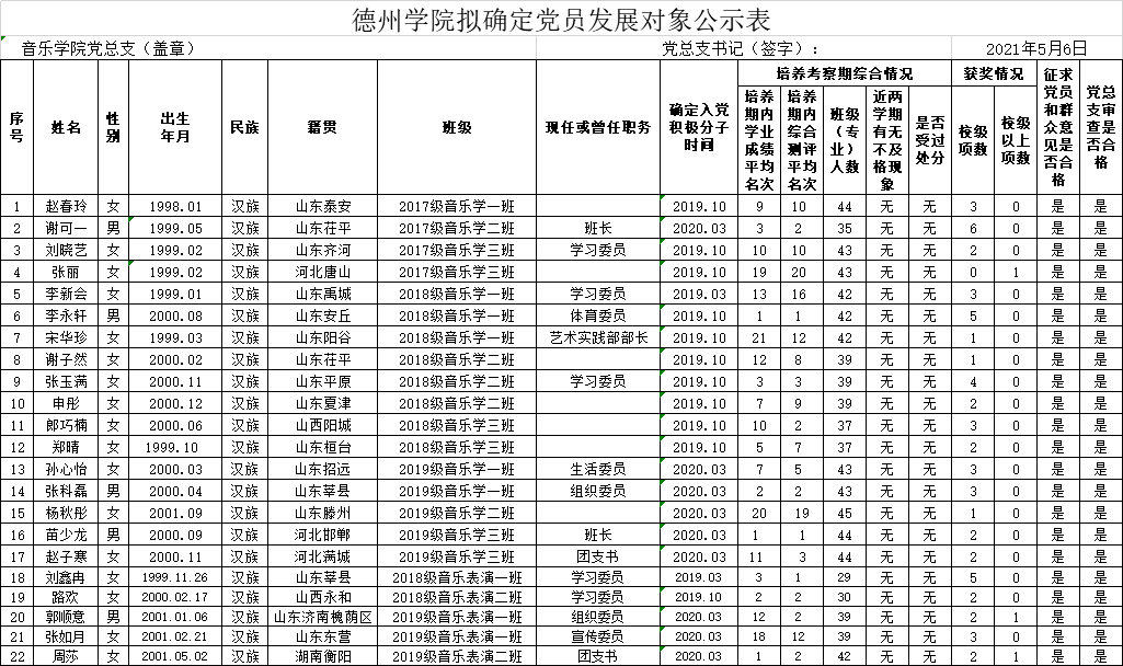 经党组织培养考察,征求党员、群众和培养联系人意见,支委会讨论研究、党总支审查,拟确定赵春玲等22人为党员发展对象。为增强发展党员工作的透明度,接受党内外群众的监督,确保发展党员的质量,根据上级文件精神和《中共太阳集团委员会发展党员工作实施细则》的要求,现将拟确定发展对象的基本情况公示如下(名单附后):