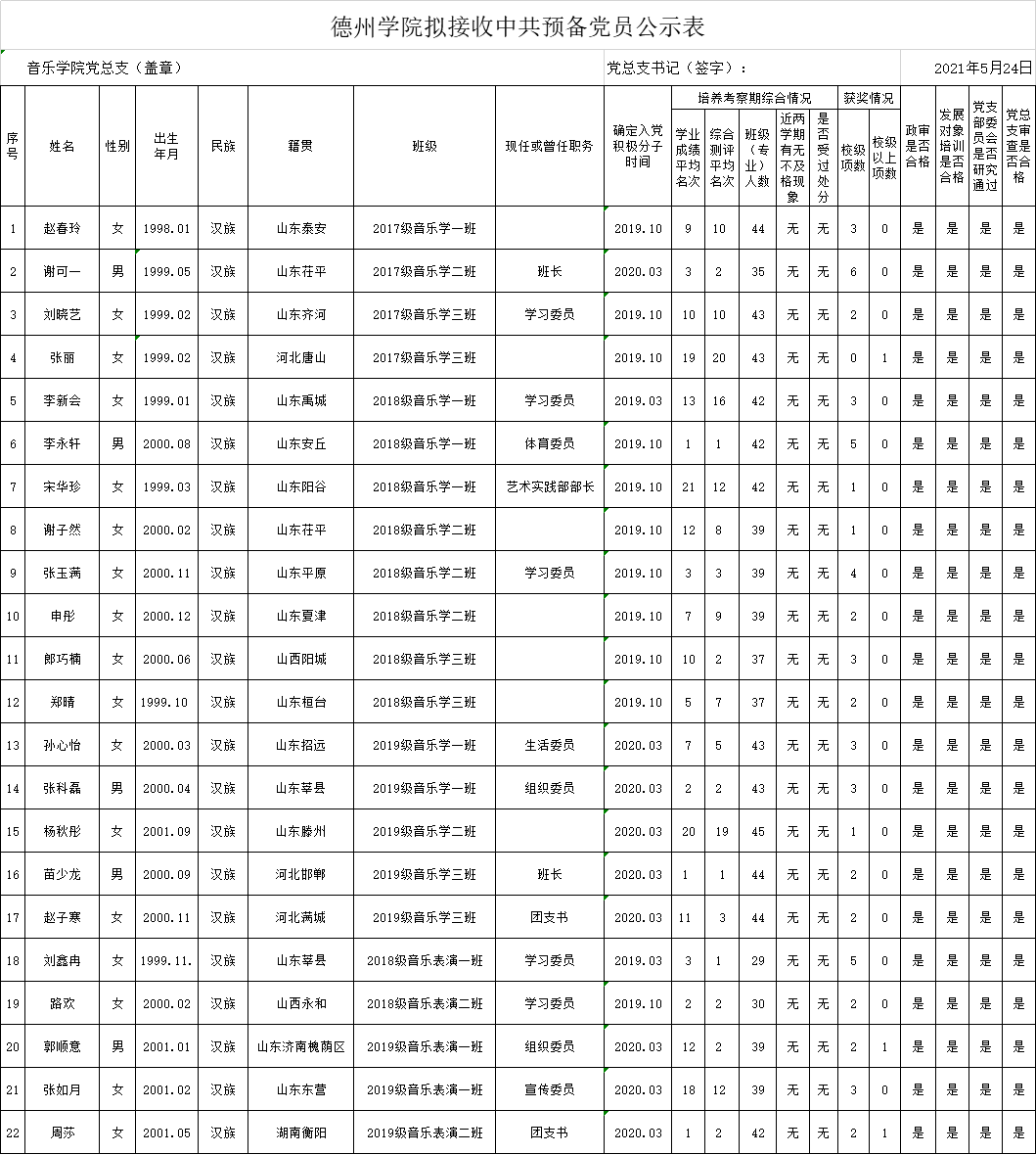经党组织培养考察,征求党员、群众和培养联系人意见,支委会讨论研究、政治审查、集中培训、党总支审查,拟接收赵春玲等22名同志为中共预备党员。为增强发展党员工作的透明度,接受党内外群众的监督,确保发展党员的质量,根据上级文件精神和《中共太阳集团委员会发展党员工作实施细则》的要求,现将拟接收预备党员的基本情况公示如下(名单附后):