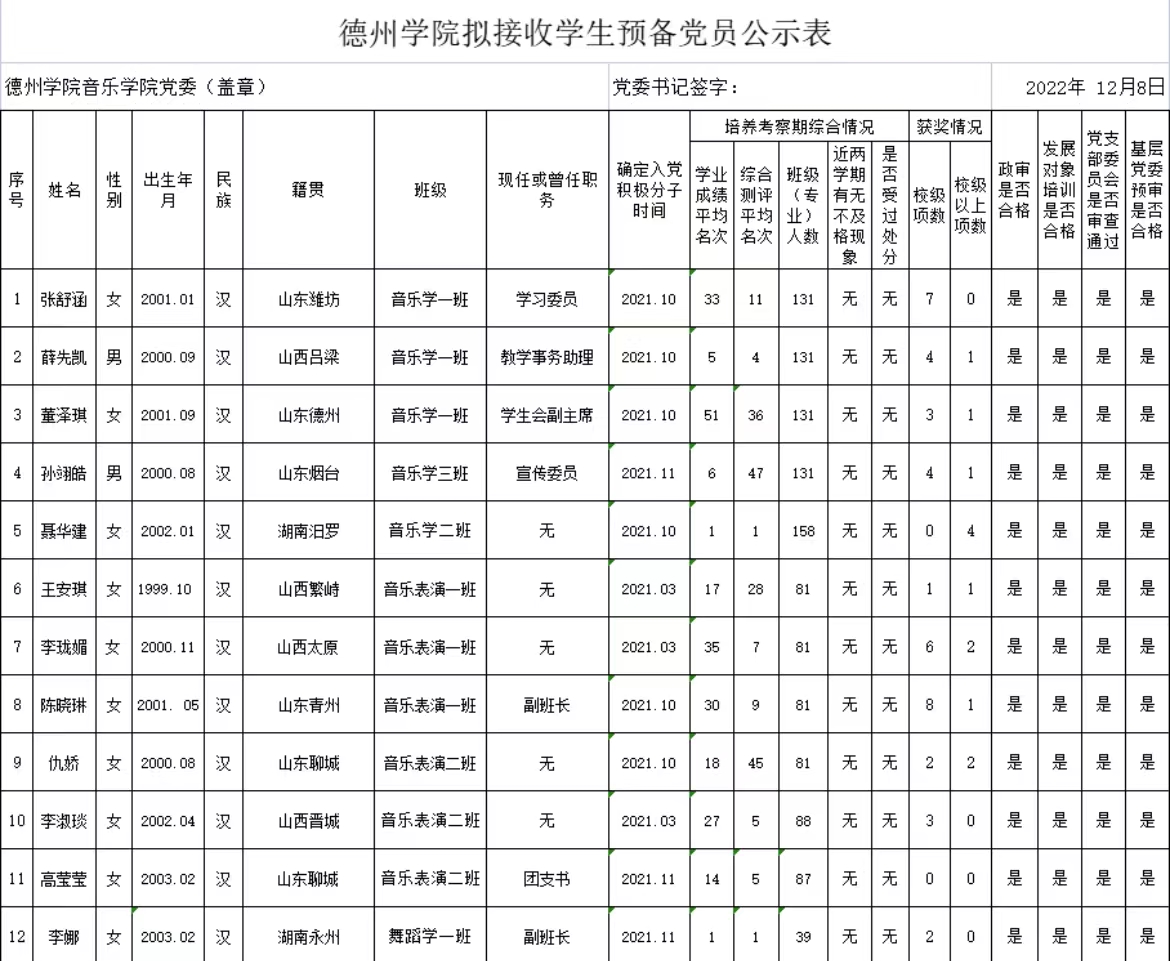 经党组织培养考察,征求党员、群众和培养联系人意见,支委会讨论研究、政治审查、集中培训、基层党委预审,拟接收韩晗等14名同志为中共预备党员。为增强发展党员工作的透明度,接受党内外群众的监督,确保发展党员的质量,根据上级文件精神和《中共太阳集团委员会发展党员工作实施细则》的要求,现将拟接收预备党员的基本情况公示如下(名单附后):