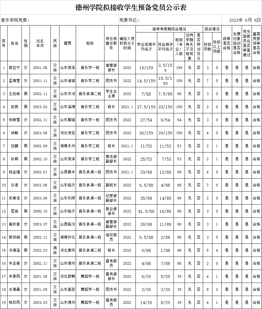 经党组织培养考察,征求党员、群众和培养联系人意见,支委会讨论研究、政治审查、集中培训、基层党委预审,拟接收郭亚宁等19名同志为中共预备党员。为增强发展党员工作的透明度,接受党内外群众的监督,确保发展党员的质量,根据上级文件精神和《中共太阳集团委员会发展党员工作实施细则》的要求,现将拟接收预备党员的基本情况公示如下(名单附后):
