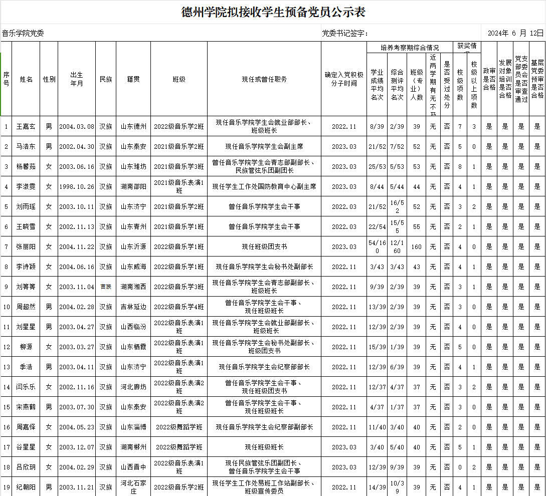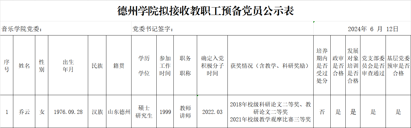经党组织培养考察,征求党员、群众和培养联系人意见,支委会讨论研究、政治审查、集中培训、基层党委预审,拟接收乔云等20名同志为中共预备党员。为增强发展党员工作的透明度,接受党内外群众的监督,确保发展党员的质量,根据上级文件精神和《中共太阳集团委员会发展党员工作实施细则》的要求,现将拟接收预备党员的基本情况公示如下(名单附后):