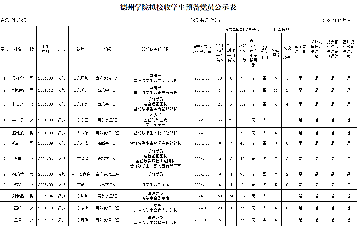 经党组织培养考察,征求党员、群众和培养联系人意见,支委会讨论研究、政治审查、集中培训、基层党委预审,拟接收孟祥宇等13名同志为中共预备党员。为增强发展党员工作的透明度,接受党内外群众的监督,确保发展党员的质量,根据上级文件精神和《中共太阳集团委员会发展党员工作实施细则》的要求,现将拟接收预备党员的基本情况公示如下(名单附后):