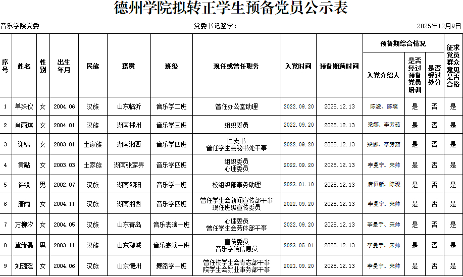 经党组织培养考察,征求党员、群众和入党介绍人意见,拟于近期讨论单殊仪等9名同志转为中共正式党员。为增强发展党员工作的透明度,接受党内外群众的监督,确保发展党员的质量,根据上级文件精神和《中共太阳集团委员会发展党员工作实施细则》的要求,现将拟讨论转正的中共预备党员基本情况公示如下(名单附后):