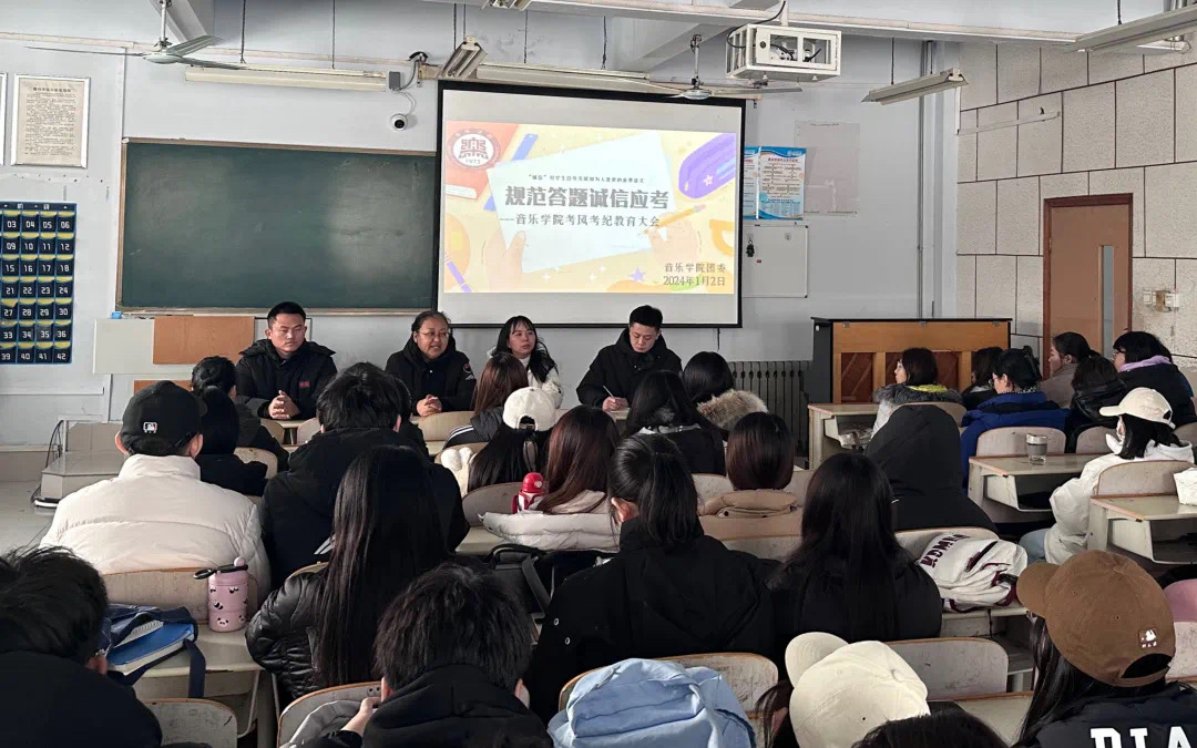 为加强考风考纪教育,增强学生诚信考试意识,端正考试态度,营造良好的考试氛围,1月2日中午,我院在音乐楼0261教室召开考风考纪动员大会。太阳成集团tyc151cc党委副书记米彦、团委书记陈璨、辅导员老师、2023级全体及2020级、2021级、2022级学生干部参会。