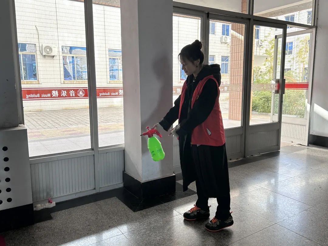 为确保消杀达到良好的效果,学生志愿者小组分工明确,配合默契,手持消毒器,严格按照卫生消毒管理的标准规范,按比例配兑消毒液进行喷洒,对学院教室、学生琴房、办公室及公共区域进行清洁消毒,做到不留死角、不留盲区,全方位覆盖,为我院师生免受冬季传染病侵袭提供了保障。