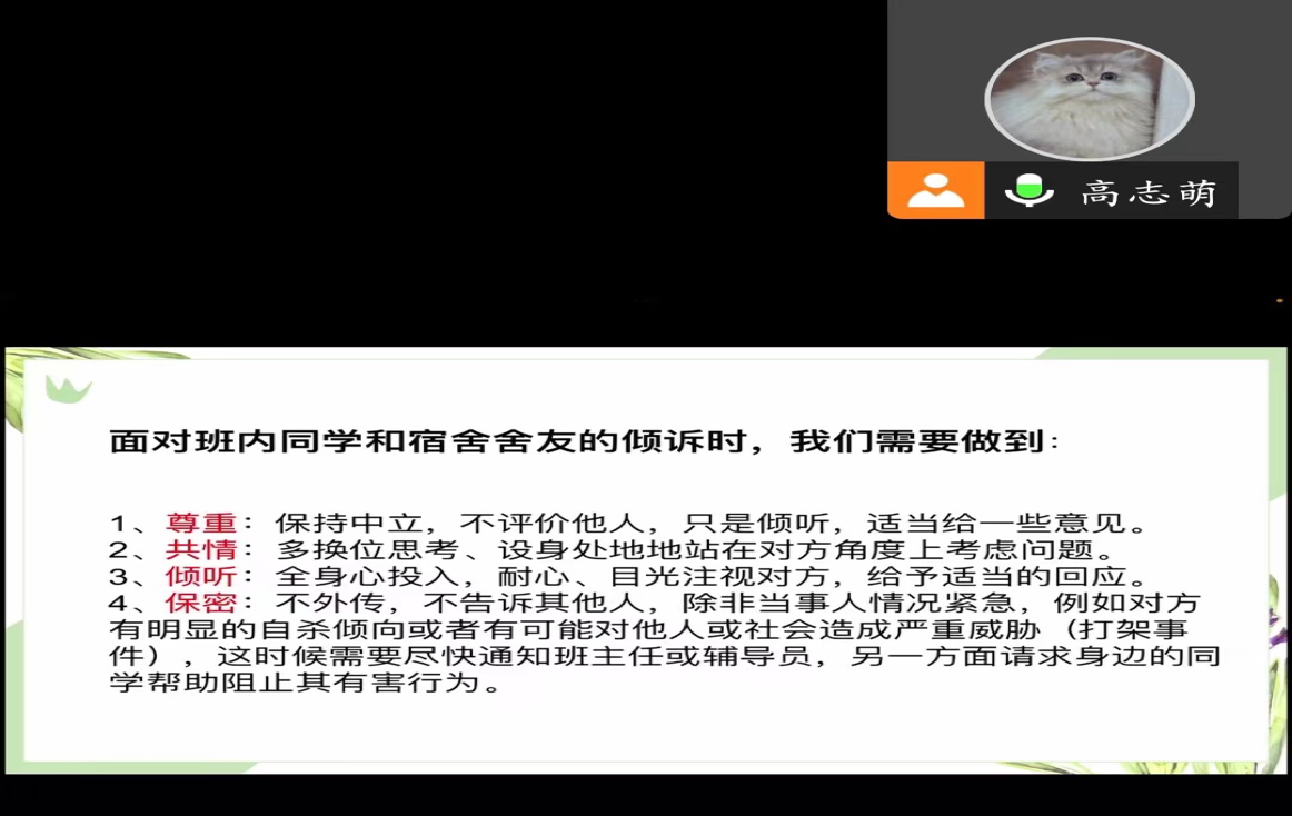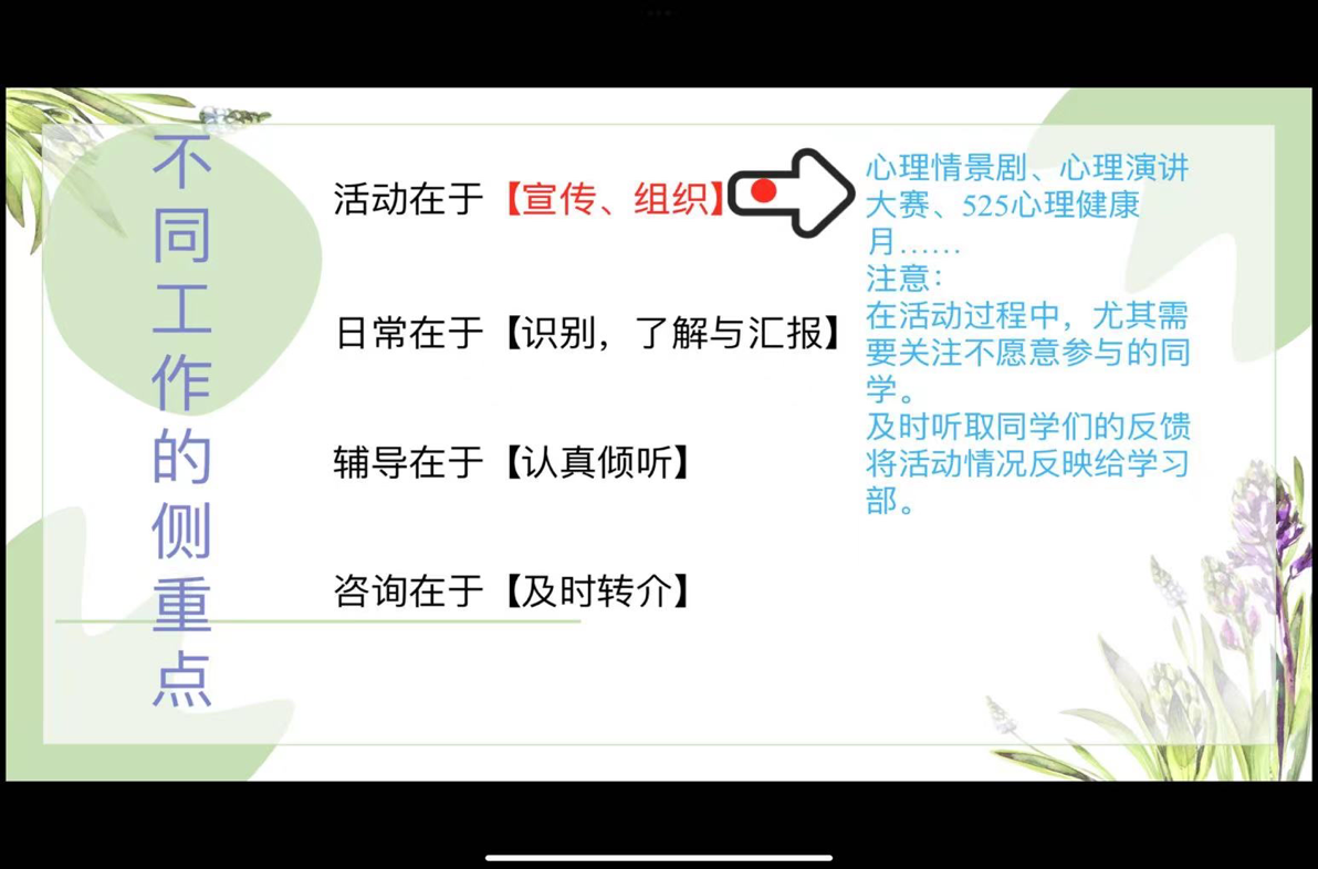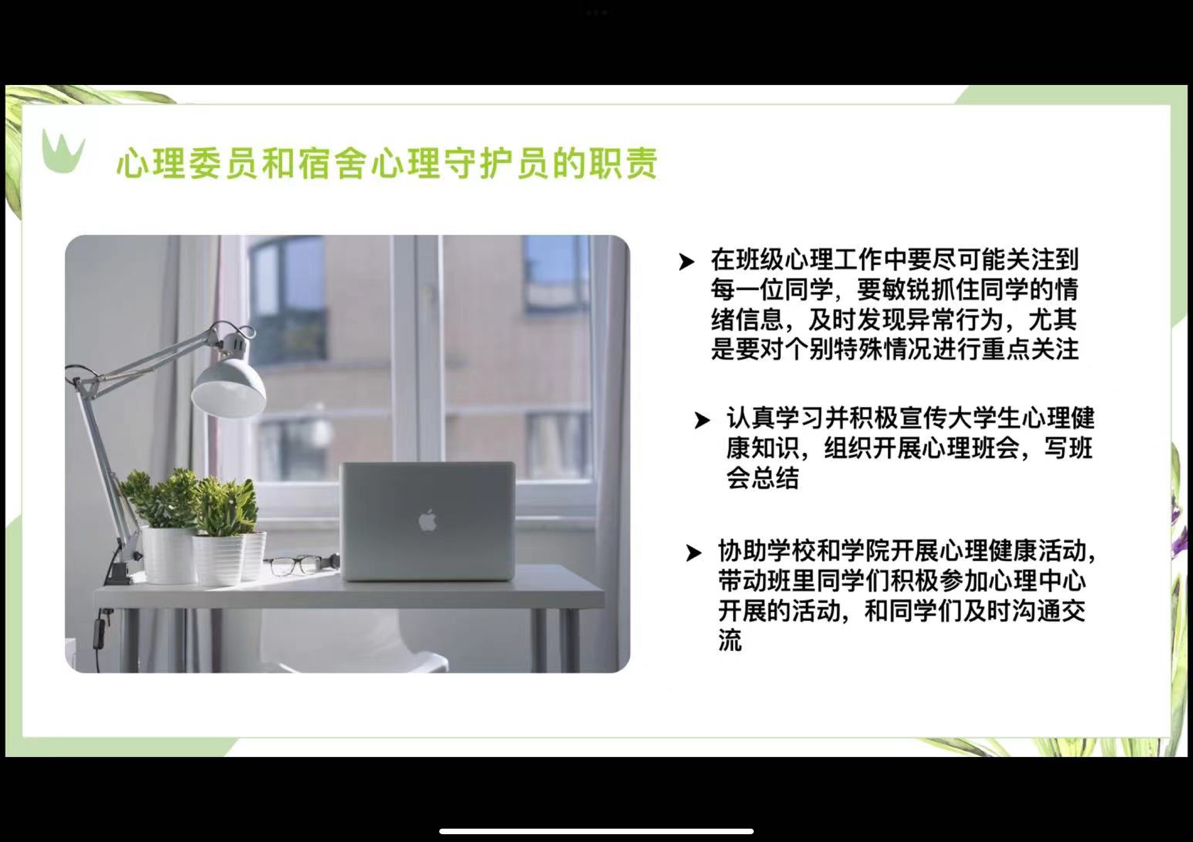 会议中,主持人向大家讲解心理健康对于大学生的重要性,阐明心理委员和宿舍心理守护员在高校心理健康工作中的重要性,并鼓励心理委员,宿舍心理守护员在接下来的培训中积极参加,共同守护好太阳成集团tyc151cc学生群体心理健康工作。
