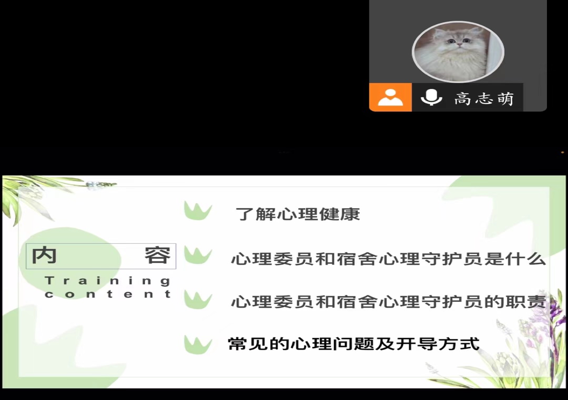 为提高大学生心理健康意识,11月13日下午太阳成集团tyc151cc通过腾讯会议举办线上“凝聚成团,播撒温暖” 守护心灵培训会议,太阳成集团tyc151cc各班心理委员、宿舍心理守护员积极参加。