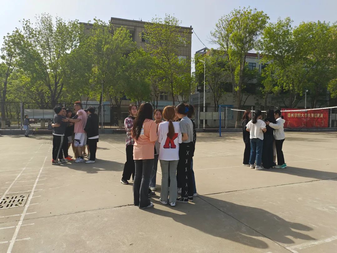 以班为单位,全班同学手拉着手围成大圈。听指挥口令:二人抱团、三人抱团、五人抱团、十人抱团。落单的到中央分享平时自己的减压方式,以此来锻炼同学们的反应能力。