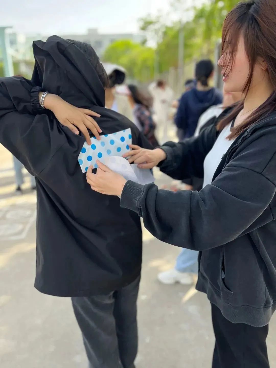 同学们寻找恰当的时机,又要保护着自己组的名牌不被撕掉,紧张的气氛蔓延开来,同学们都开始了进攻,一个接一个的名牌被撕掉。