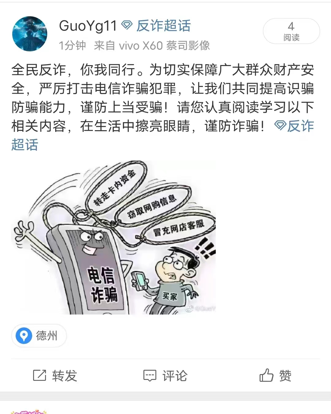 活动期间,我院按照“打击治理电信网络诈骗犯罪集中宣传月”的活动要求,采取线上线下相结合的方式,积极开展防范电信网络诈骗宣传活动。此次活动,开展了防诈骗主题讲座、宣传国家反诈app、签署防诈骗倡议书等多种形式。充分利用微博、抖音等网络媒体,发布识骗要点及防范提醒,极大的发挥了互联网新媒体覆盖广的优势,增强了学生的防范意识。