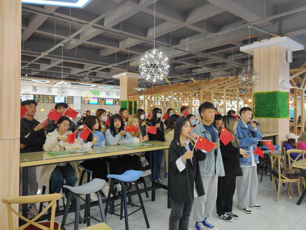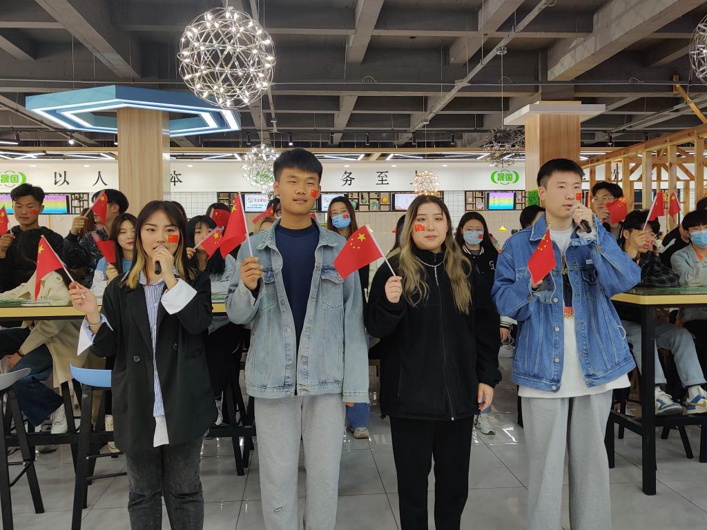 中午12点,一曲激情、熟悉的《我的祖国》在第三餐厅响起,演唱者与全场人员挥动着手中的国旗,一起跟着音乐,歌唱《我的祖国》。悠扬的旋律,热情真诚的演唱,全场的热情持续高涨。学生们一起放声高歌,祝福伟大祖国国泰民安、繁荣昌盛,新时代越来越美好。每一句歌词都诠释了不朽的历史,体现了人生崇高的理想与信念,引起在场每一位学生心上最朴质的共鸣。