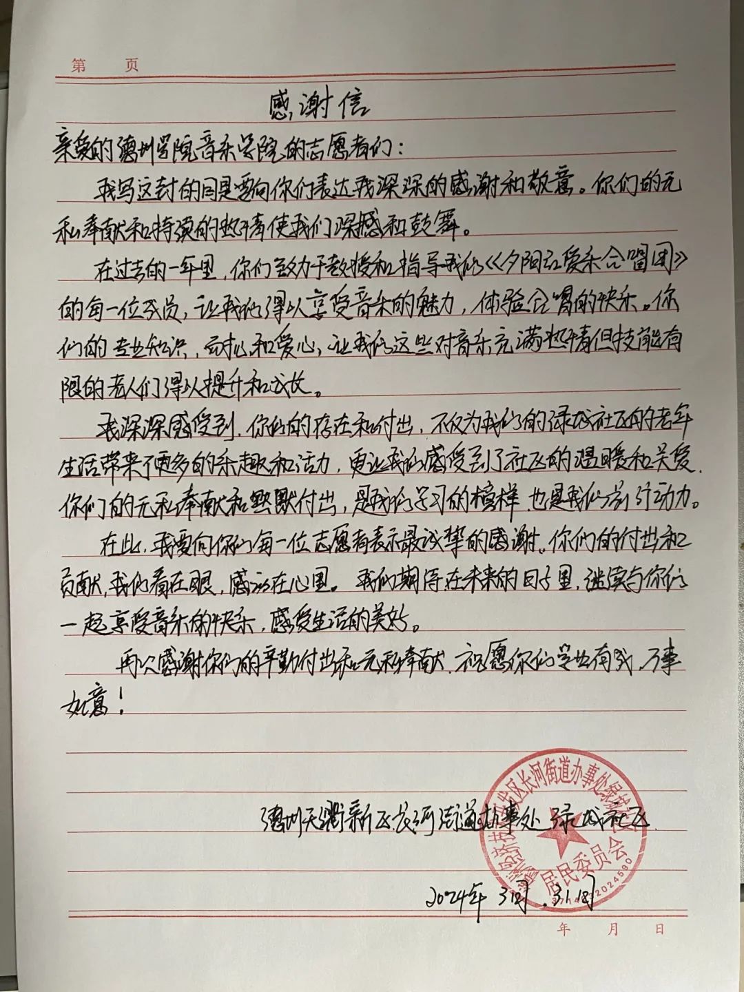 信中,既表达了对志愿者们辛勤付出的感激之情,同时也传达了社区群众对学院青年志愿者专业水平的认可。自2023年起,太阳成集团tyc151cc志愿者每周都会到绿城社区,为社区老人组成的“夕阳红”爱乐合唱团进行指导排练。累计上岗110余人,在志愿者的专业指导下,“夕阳红”爱乐合唱团表演水平得到了逐步提高,也吸引了越来越多的老年人参与进来。丰富了居民们的日常生活,收获了良好的效果。