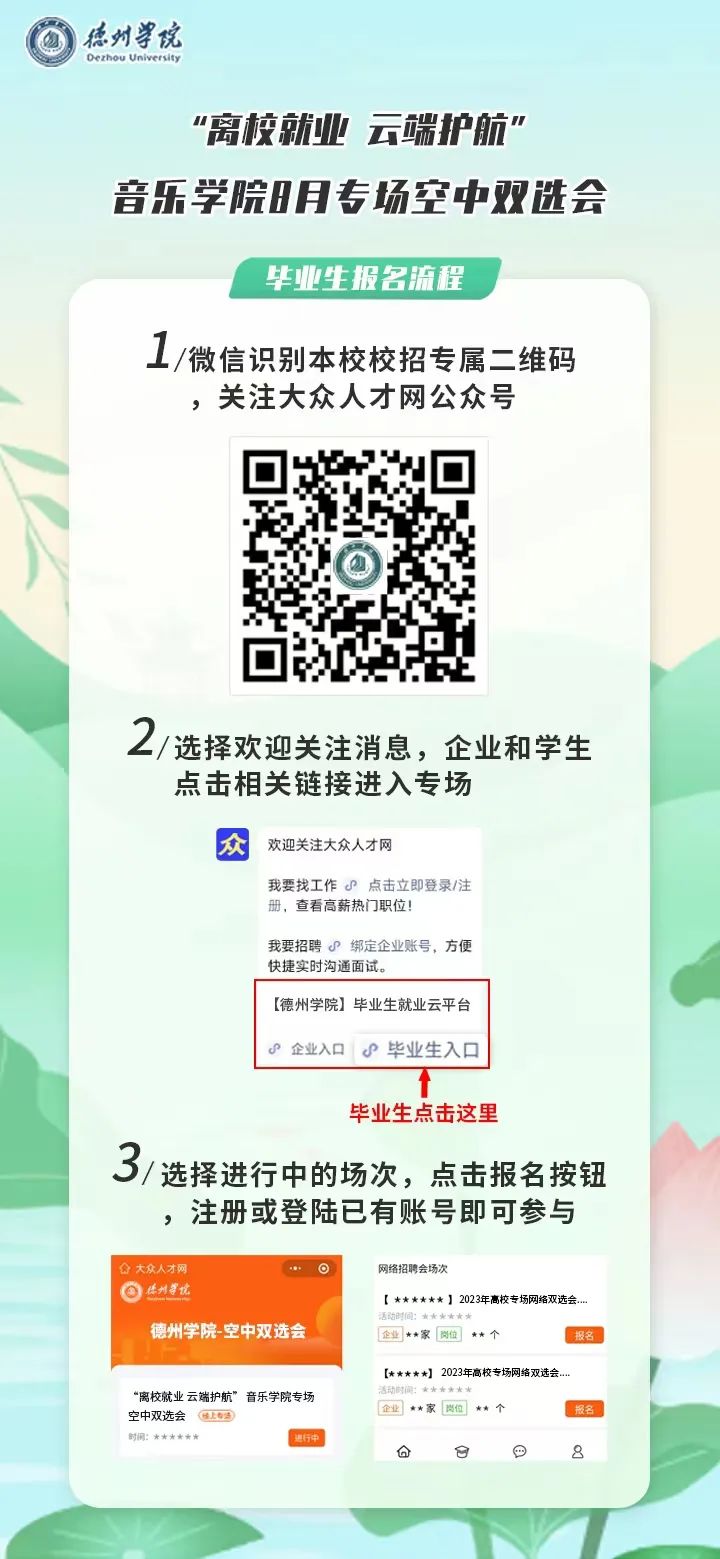 手机微信扫码关注“大众人才网”微信公众号,企业和毕业生分别点击相关按钮进入太阳集团校招端口,点击本学院报名按钮,注册或登录已有账号即可直接参与。