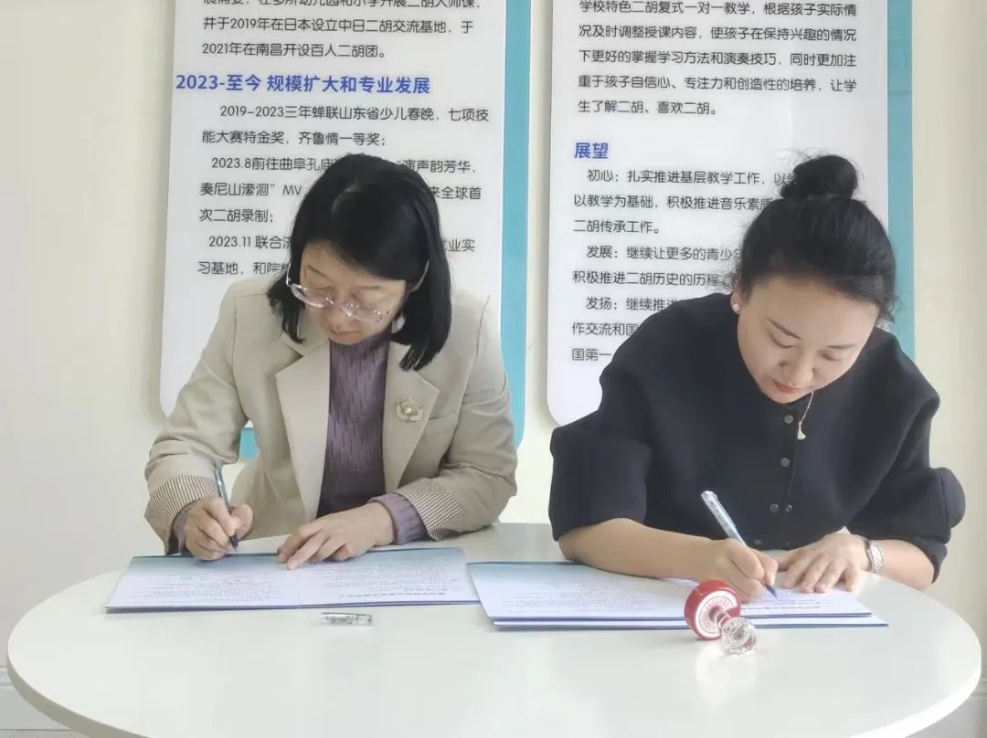 企业负责人李玥君对我院一行人员的到访表示热烈欢迎,双方围绕就业基地建设、传统乐器二胡人才的培养、民族文化的传承以及毕业生就业优选等方面进行座谈。随后,共同参观校区建设、聆听企业发展愿景,观看毕业生代表、双方教师代表、联合曲艺演奏等技能展示。一致表示,将以本次访企拓岗促就业专项行动为契机,加强专业领域多维联动,促进专业人才双向交流,为更多优秀毕业生搭建就业创业的高质量平台。最后,双方共同签订就业基地协议,并为就业基地挂牌。