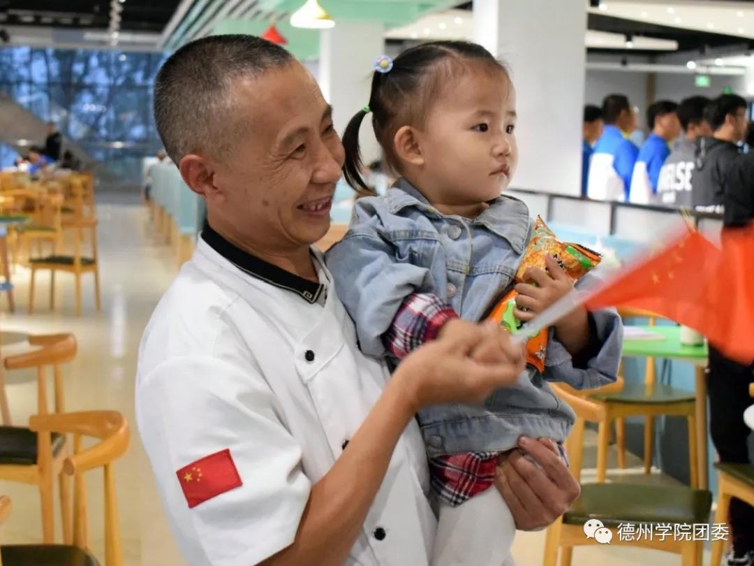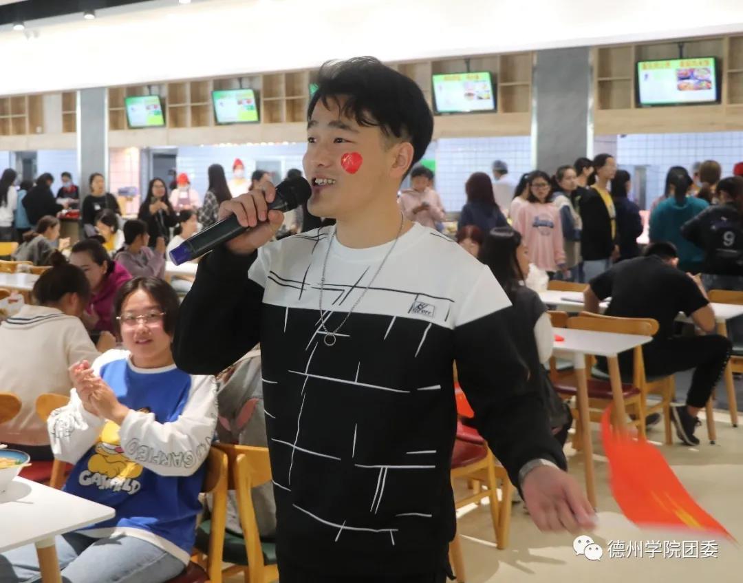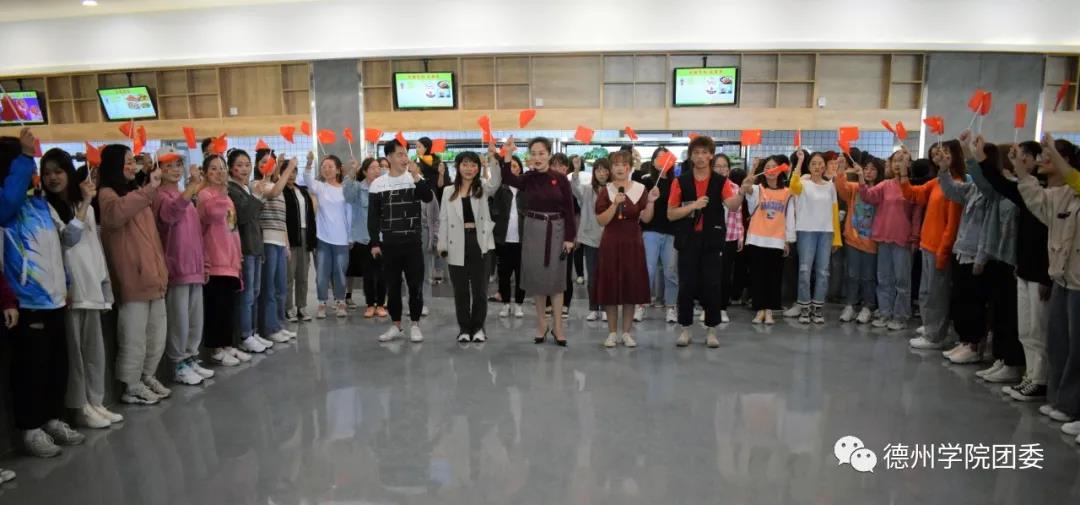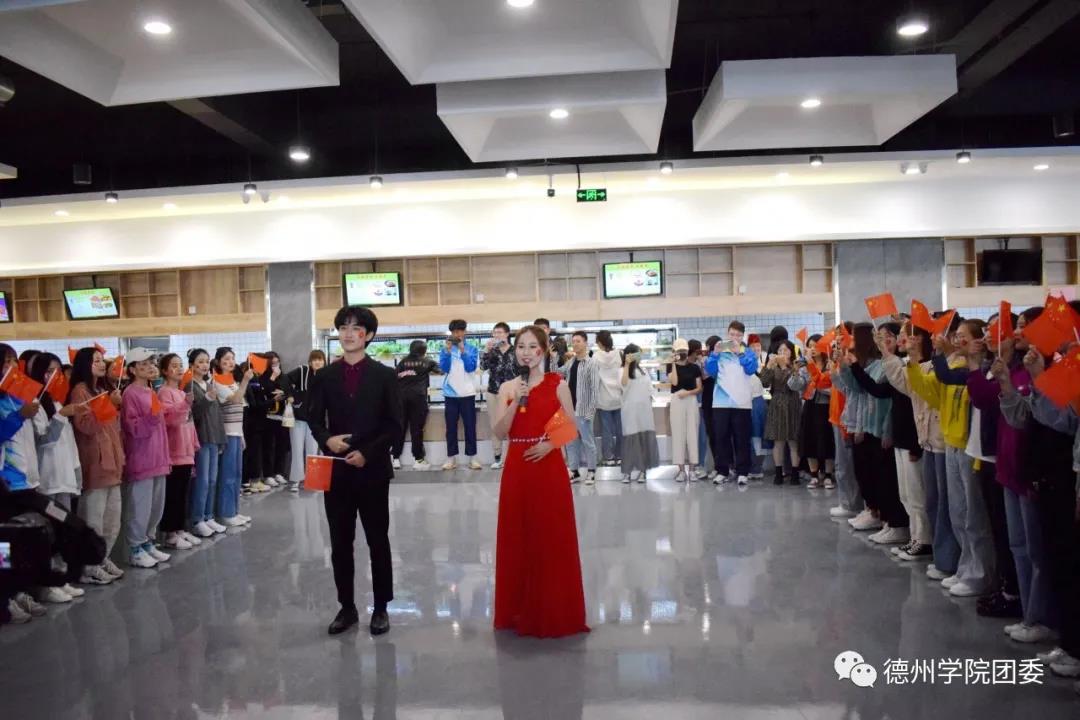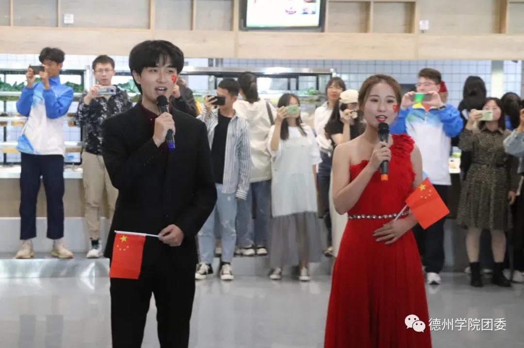 为献礼伟大祖国71华诞,激励和引领广大青年学生大力弘扬以爱国主义为核心的民族精神和时代精神,创新大学生思想政治教育引领工作,9月30日中午11点,校团委和太阳成集团tyc151cc、教师教育学院在四餐二楼联合举办了一场精彩而富有意义的“国庆红歌快闪”活动。1000余名德院师生参与其中,现场洋溢着青春的气息,用共唱红色歌曲的方式表达着对伟大祖国的热爱和敬仰。悠扬旋律萦绕在餐厅上空,吸引多位师生现场驻足观看。