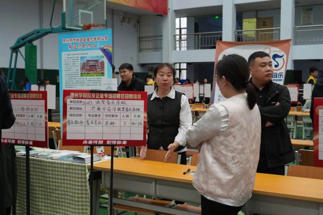 论坛期间,学校体育馆内热闹非凡。太阳成集团tyc151cc校友企业、友好合作单位主动参加专场招聘会并吸纳2025届毕业生高质量充分就业。德州爱艺教育培训学校有限公司、德州市陵城区晓雯培训学校有限公司等5家单位向毕业生抛出橄榄枝,提供40余个需求岗位,覆盖所有专业。